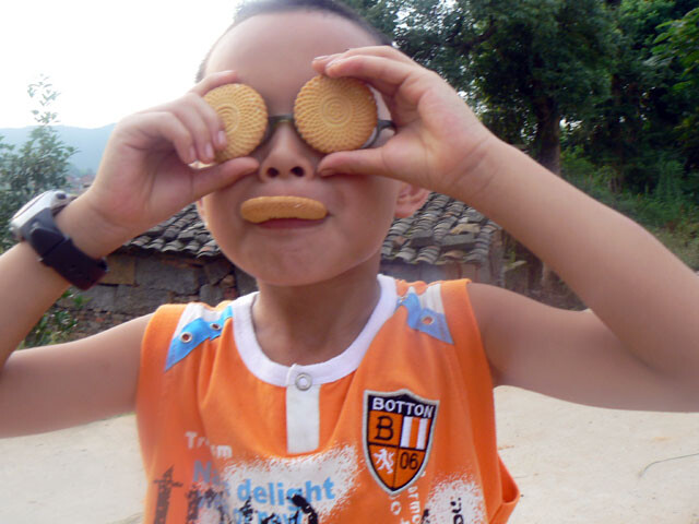 老大支子豪,一贯是调皮捣蛋的,这副装扮不妨称之为饼干超人: