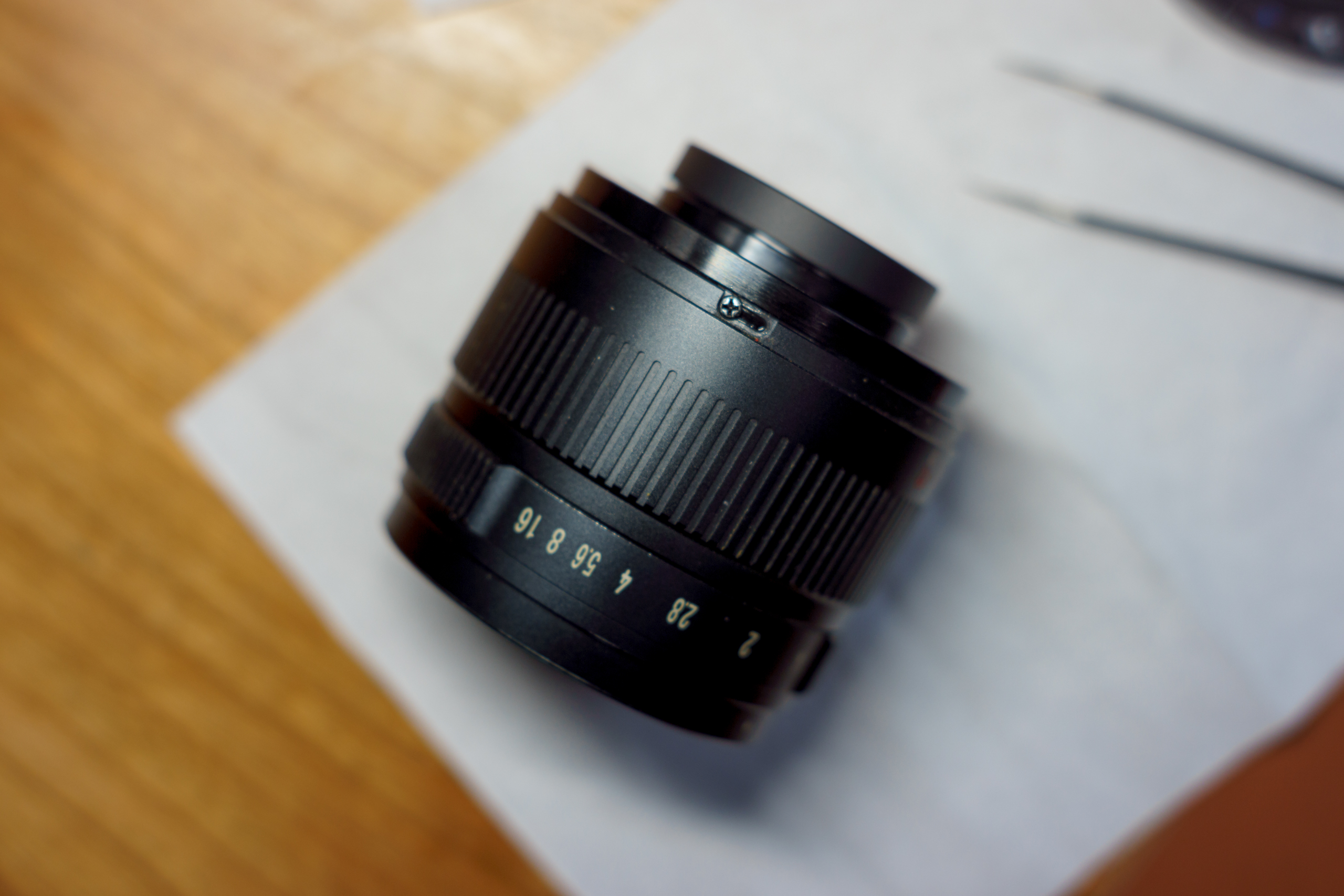 比如我今天打算调整的这支镜头,七工匠 55mm 1.4,全开极肉,畸变在标头里面也算是比较大的,但略收一点光圈画质就比较扎实了,还透着一种复古的柔焦调子,算得上是一枚颇可玩味的人像镜头。无极光圈手感扎实,但对焦环松松垮垮,操作起来毫无精准度,已经到了不纠正就无法使用的痛苦程度——悔不该当初没有直接退货,自己还是太马虎了。