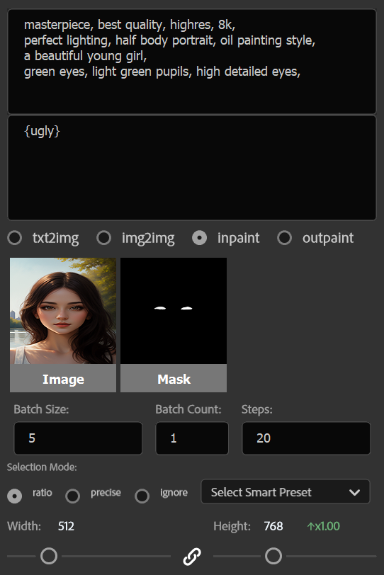 此时建议将 Prompts 内关于人物整体的部分去掉,只需要眼睛的描述即可,因为我们重绘的部分只包括眼睛,保留人物的描述反而会造成干扰。而且该方法重绘的面积更小,理论上消耗的资源更低。