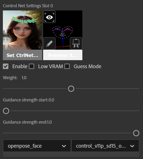 没奈何,那还是重绘一下全图试试。Ctr + A 选择全图,为了保持女同学的姿势不变,SD4PS 切换到 ControlNet 标签页,激活 slot1,选择 openpose-face 模型: