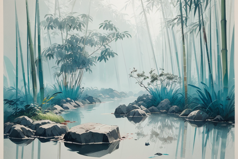 意境不错,但假山园林的比重太高了。不如化繁为简,专注于竹子,假山可以后期合成。去掉假山的关键词,重新输出: