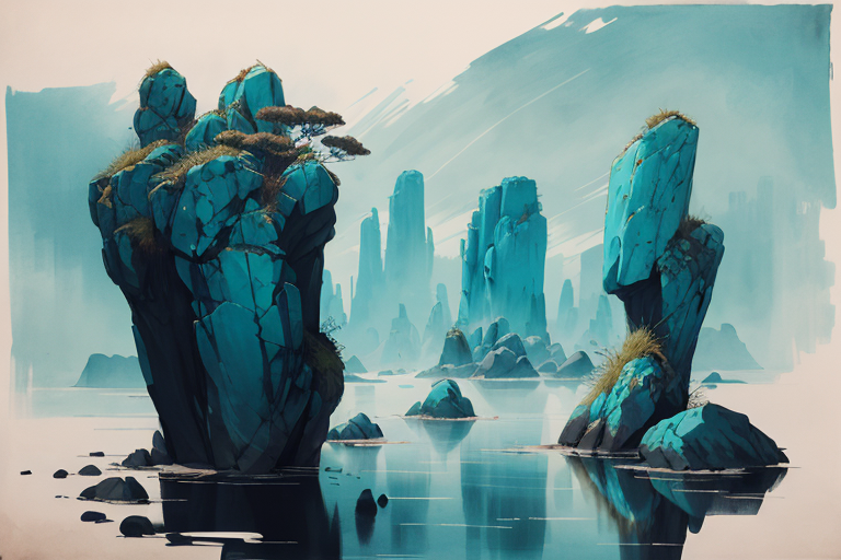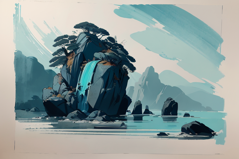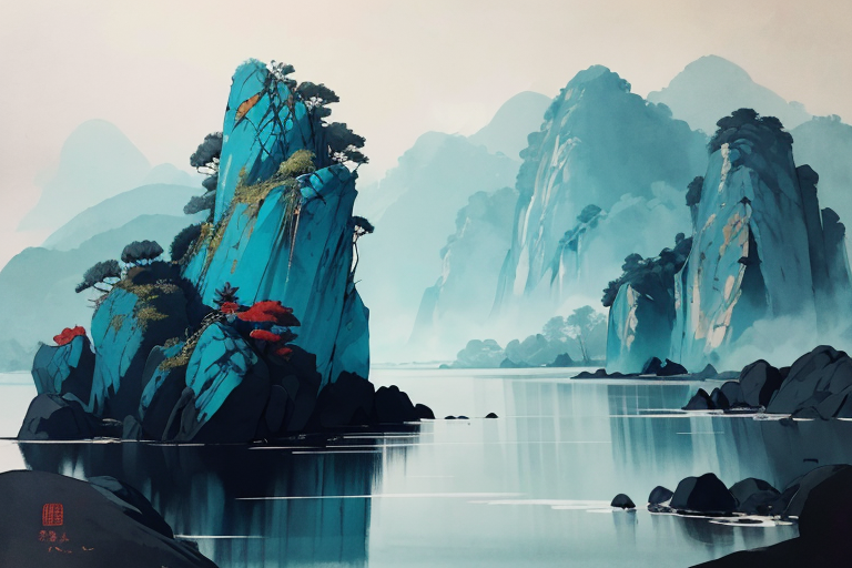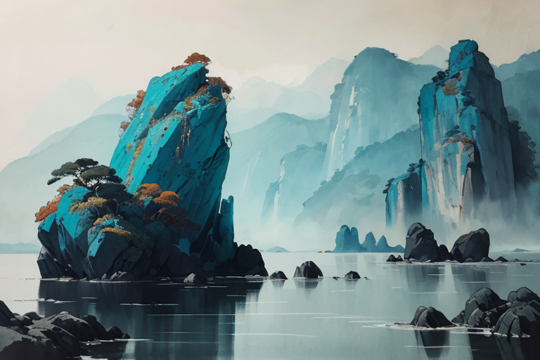 过于强调流动感,画面的冲击力是有了,但不太符合我们想要的传统美学。我们去掉 fluid motion,同时将 monochromatic 更换为 turquoise theme,增加假山,这样就可以将黑白的水墨画换成青绿色主题,看看效果如何?
