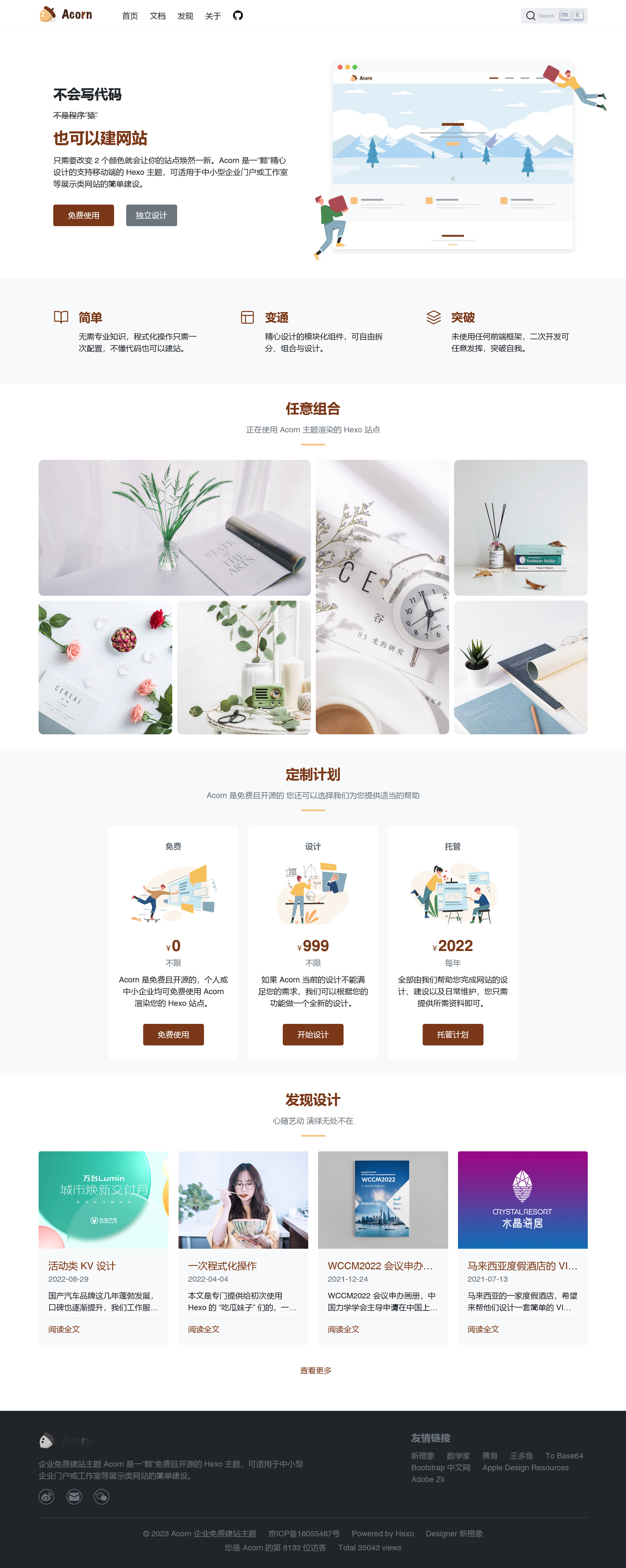 Acorn 是一“颗”免费且开源的 Hexo 主题,可适用于中小型企业门户或工作室等展示类网站的简单建设。如果你对 Hexo 基本操作已经很熟悉了,那么本文将会辅助你轻松使用 Acorn 主题搭建自己的网站, 亦或者你可以先阅读一下 Hexo 文档。