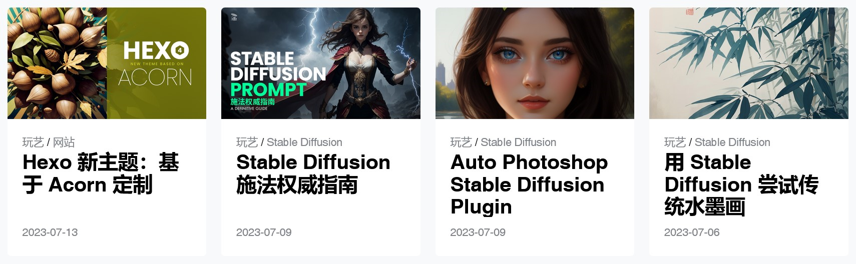 不过网站不能再和以前一样简简单单写博客,现在得展示更多的专业能力。出于这样的动机,去 Hexo 官方主题站里翻检了几遍,发现 Acorn 还挺合适的,下载到本地试着配置了一下,立马有改头换面的感觉,于是开始定制细节。