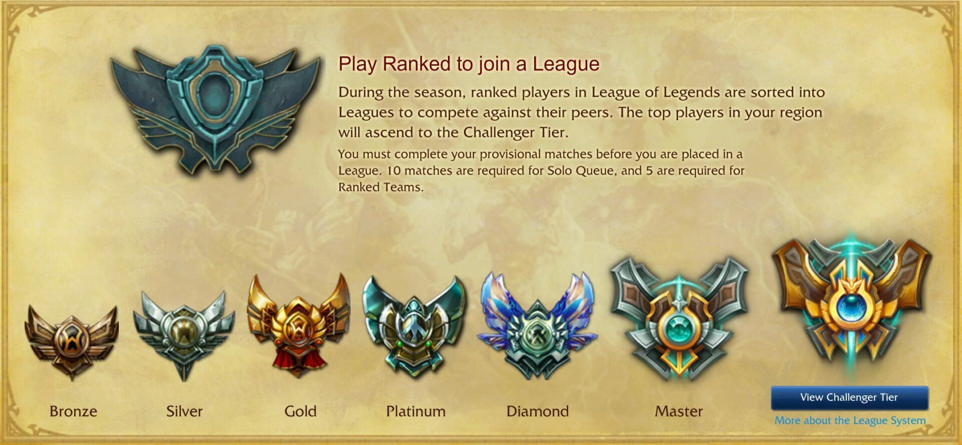 英雄联盟 2019 年以前的段位图标,它定义了大多数玩家习惯的从青铜到王者的段位设置。