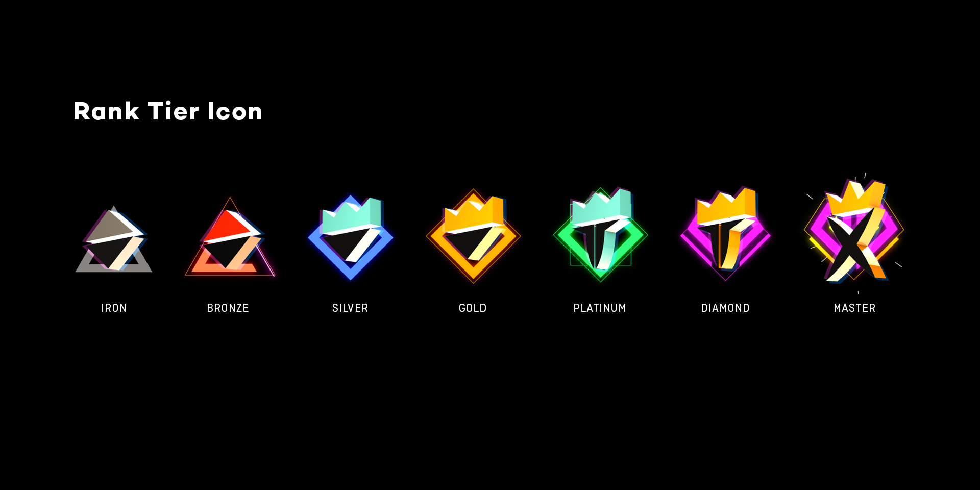 这个段位图标跟守望先锋那一套是一个风格,但处理得干净利落,以字母 A 为基础,随段位提升逐级增强装饰感,在最高的两个段位打破之前的常规,绝顶高手的超拔感立刻就体现出来了。