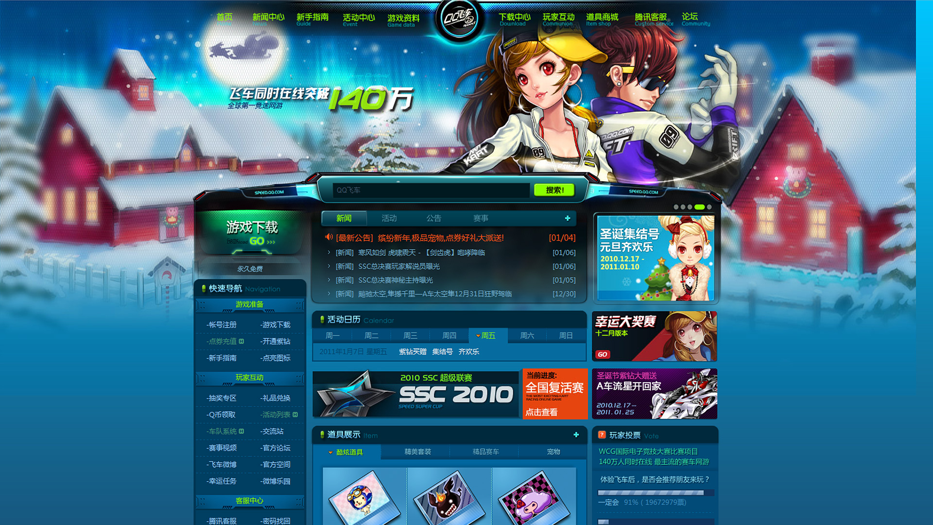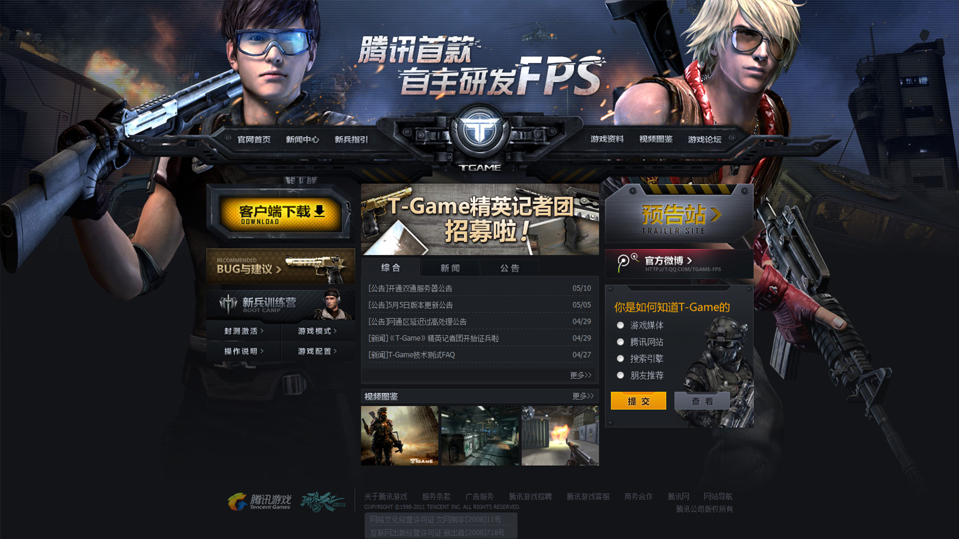 所以早几年的国内游戏网站,大体是这样的,布局还是向韩国看齐,但细节上非常强调视觉效果以及游戏品牌的差异化。设计师总要绞尽脑汁,把那些可以体现游戏调性和品牌特征的元素添加到设计里去,譬如QQ飞车的车身流线造型,QQ仙境的空岛木牌,逆战(当时还在用早期的开发代号T-Game)的机械构造导航栏: