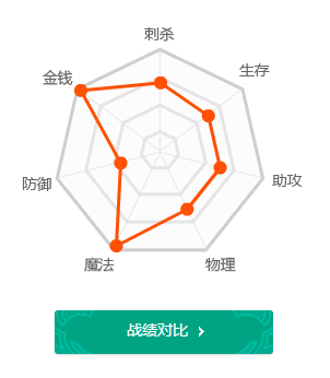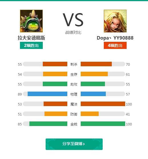 可以看到,这位玩家能力全面360度无死角,防御数值偏低只是因为他很少使用坦克英雄,魔法和金钱数值都满格,则说明他是个中单超级大刷子。雷达图下面还有一个“战绩对比”的功能,虽然和他相比,我只是个白银分段的弱者,但玩的位置不一样导致我的个别数值竟然比他高,这还真是不得了!必须马上猛击“分享至微博”按钮,让全世界都知道我和 DOPA 也只是各有千秋而已,哈哈。