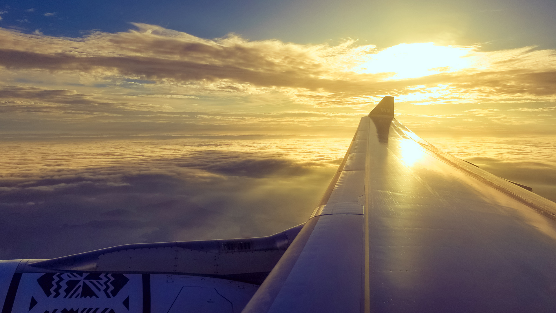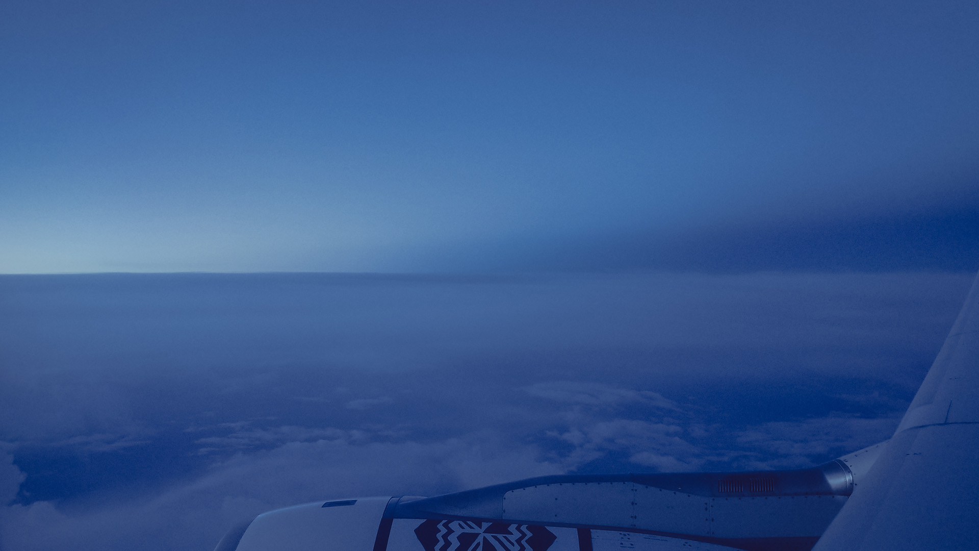 凌晨两点,天色稍稍透亮。虽然机翼掠过还是一片幽寂荒寒的蓝色,但往前望去,最远端的云层却已被抹上一道浅浅的暖色,鱼肚白的天际线仿佛是机翼喷印出来的,自西而东,蓝白的分界线越来越清晰。那暖色也晕染渐开,终至于大亮,将黑夜抛离在飞机后面。虽然窗户没有正对日出的方位,但阳光照洒在一旁的机翼上,确然已是天明了。