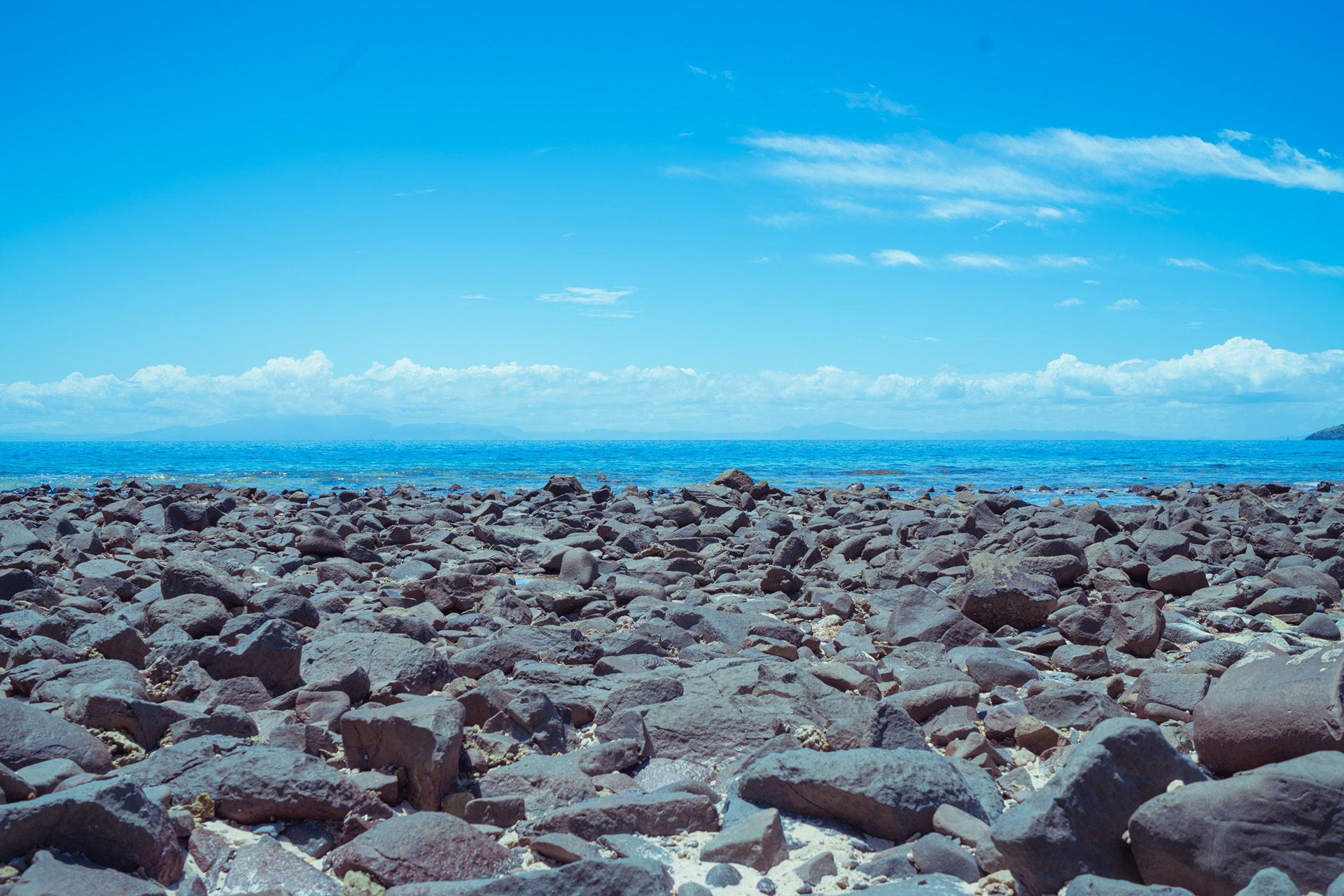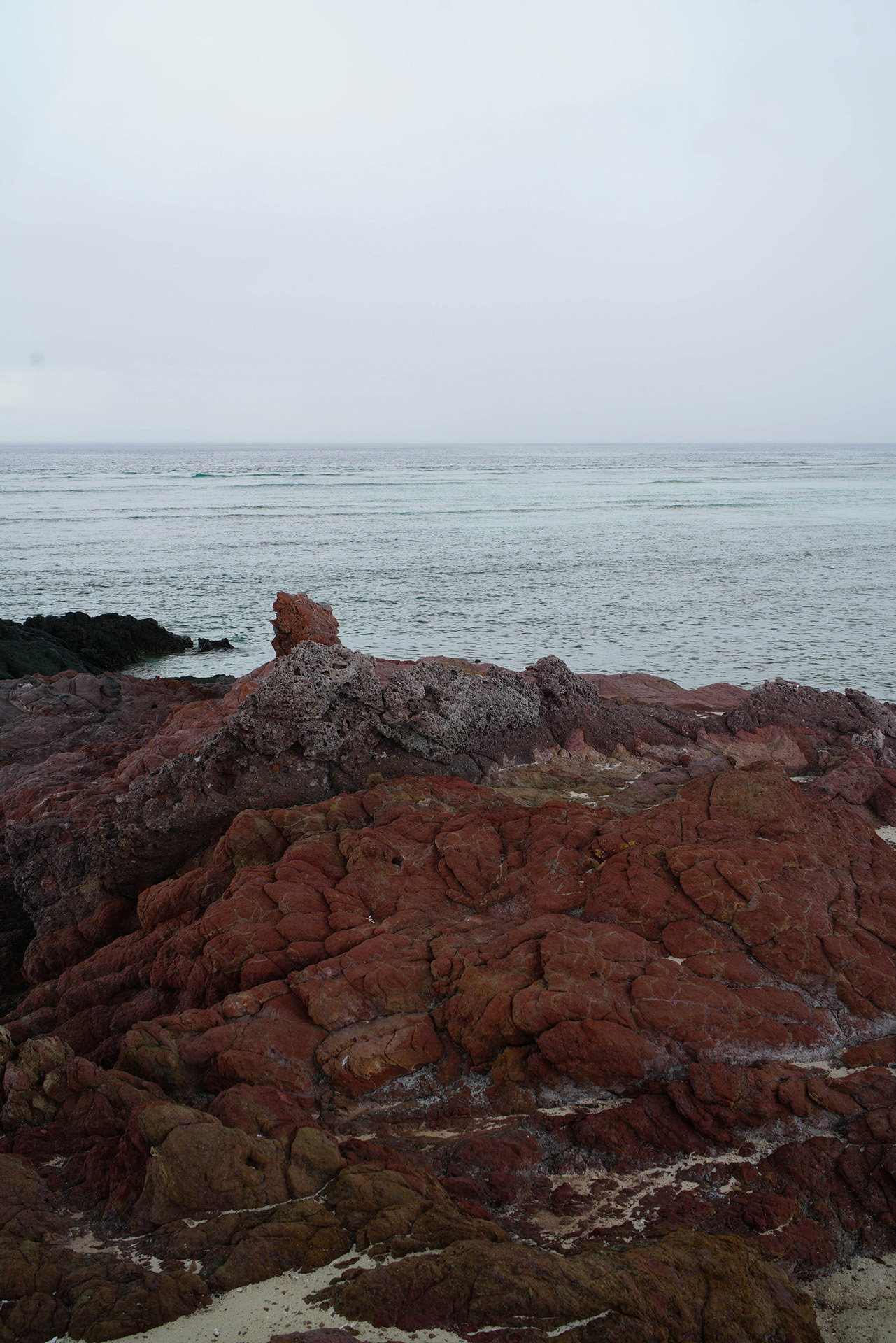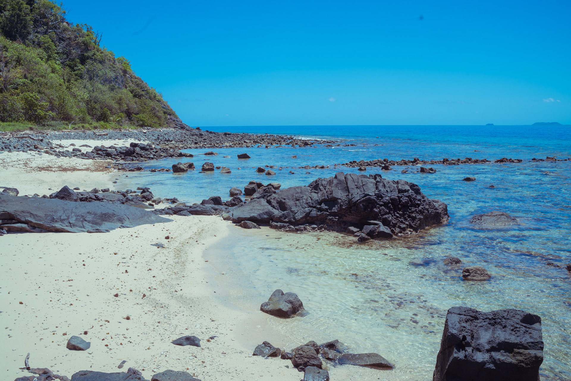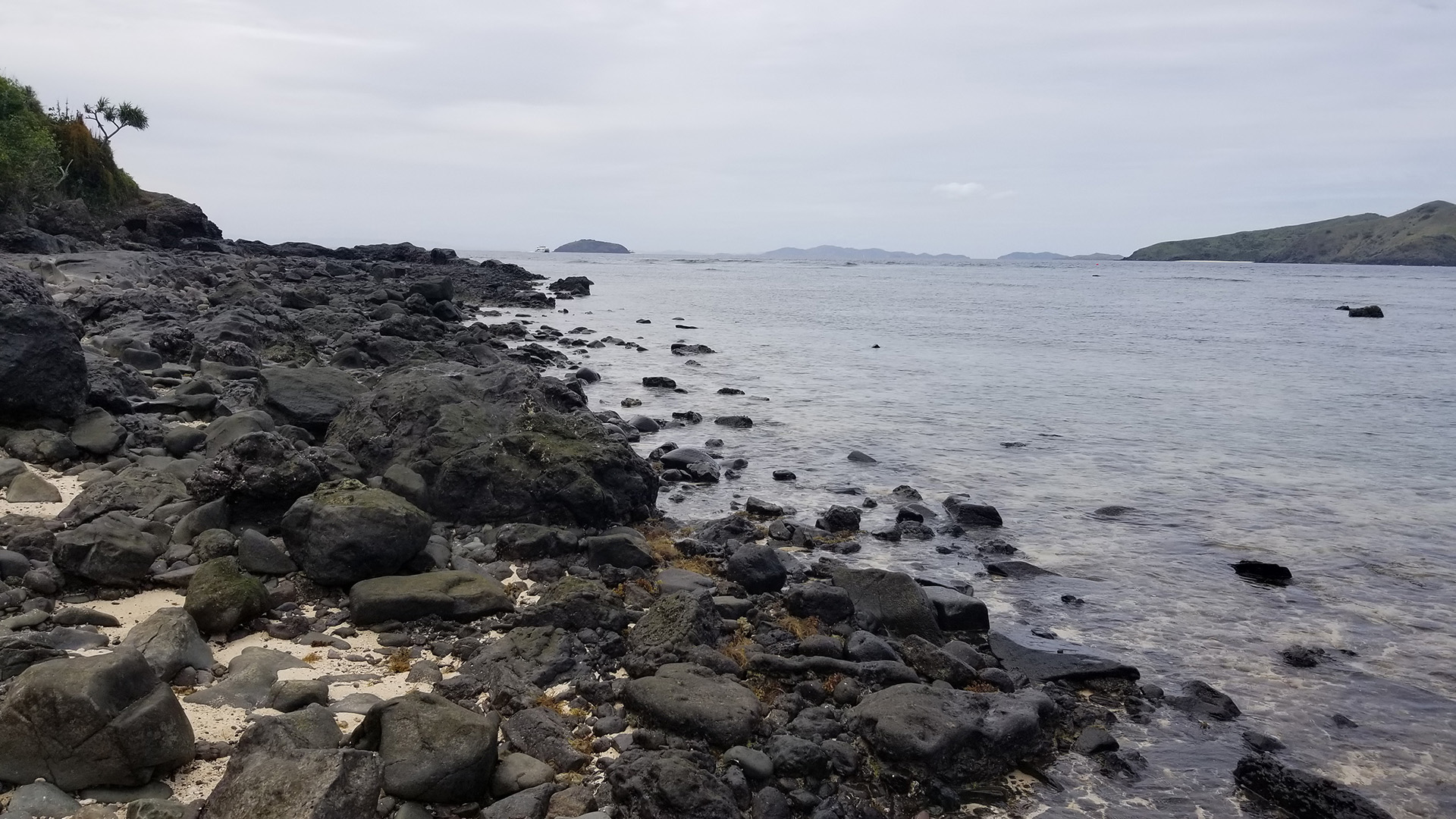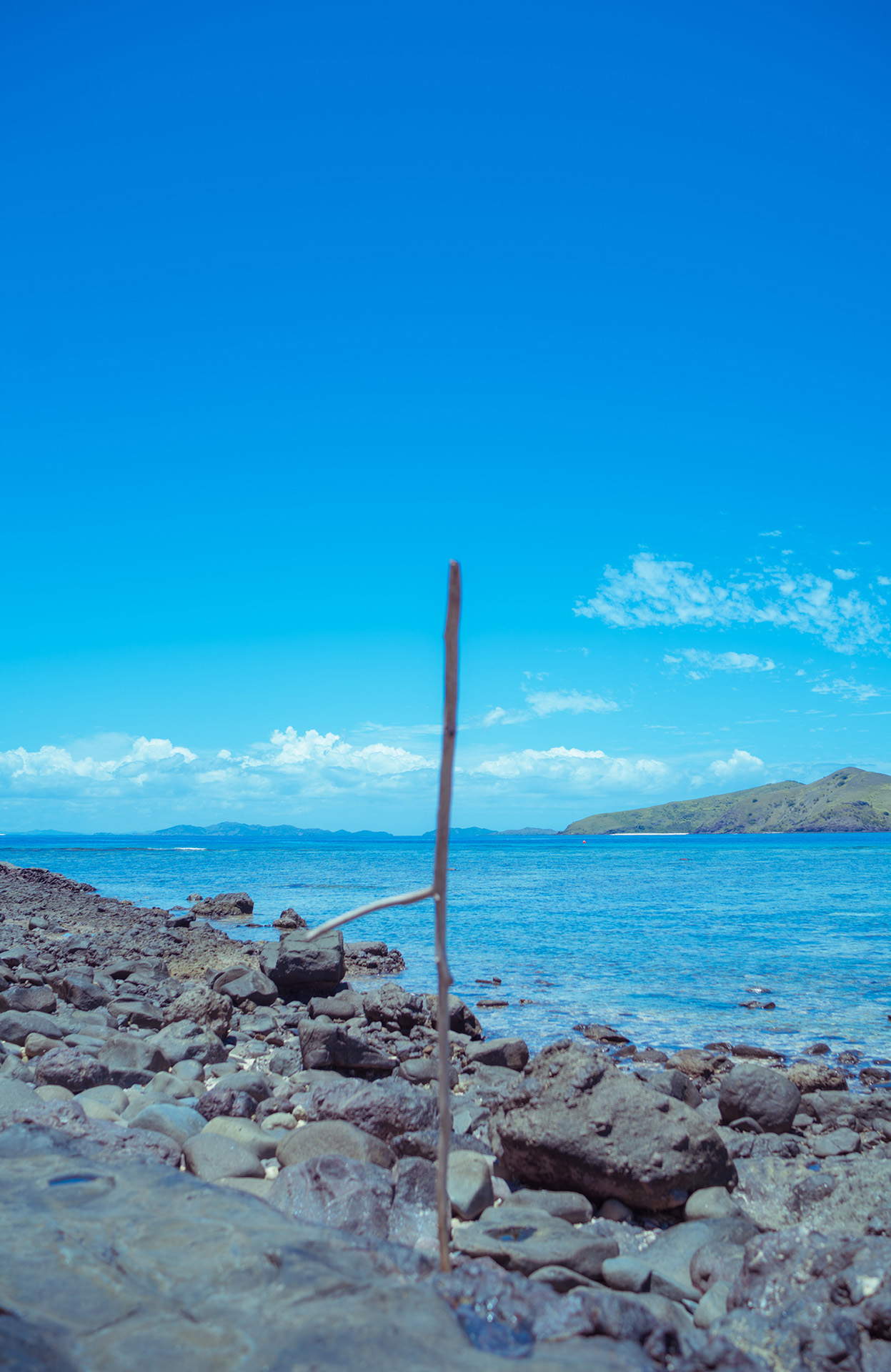 潮平石出,忽生一念,Tokoriki 直径才一千多米,何不徒步绕岛一圈?从礁岩下穿过去,乱石千堆,嶙峋蹭蹬,坎坷难行。在岸边找了一截枯枝,早被太阳晒成惨白,折断枝桠,聊用作手杖,倒感觉轻便又稳当。继续前行越过好几道弯,依然是礁石乱立,无路可寻,偶尔才空出几块小小的平沙。