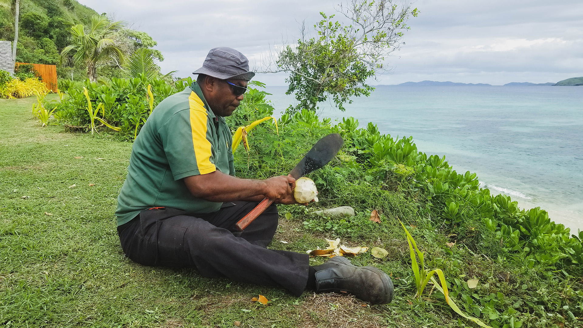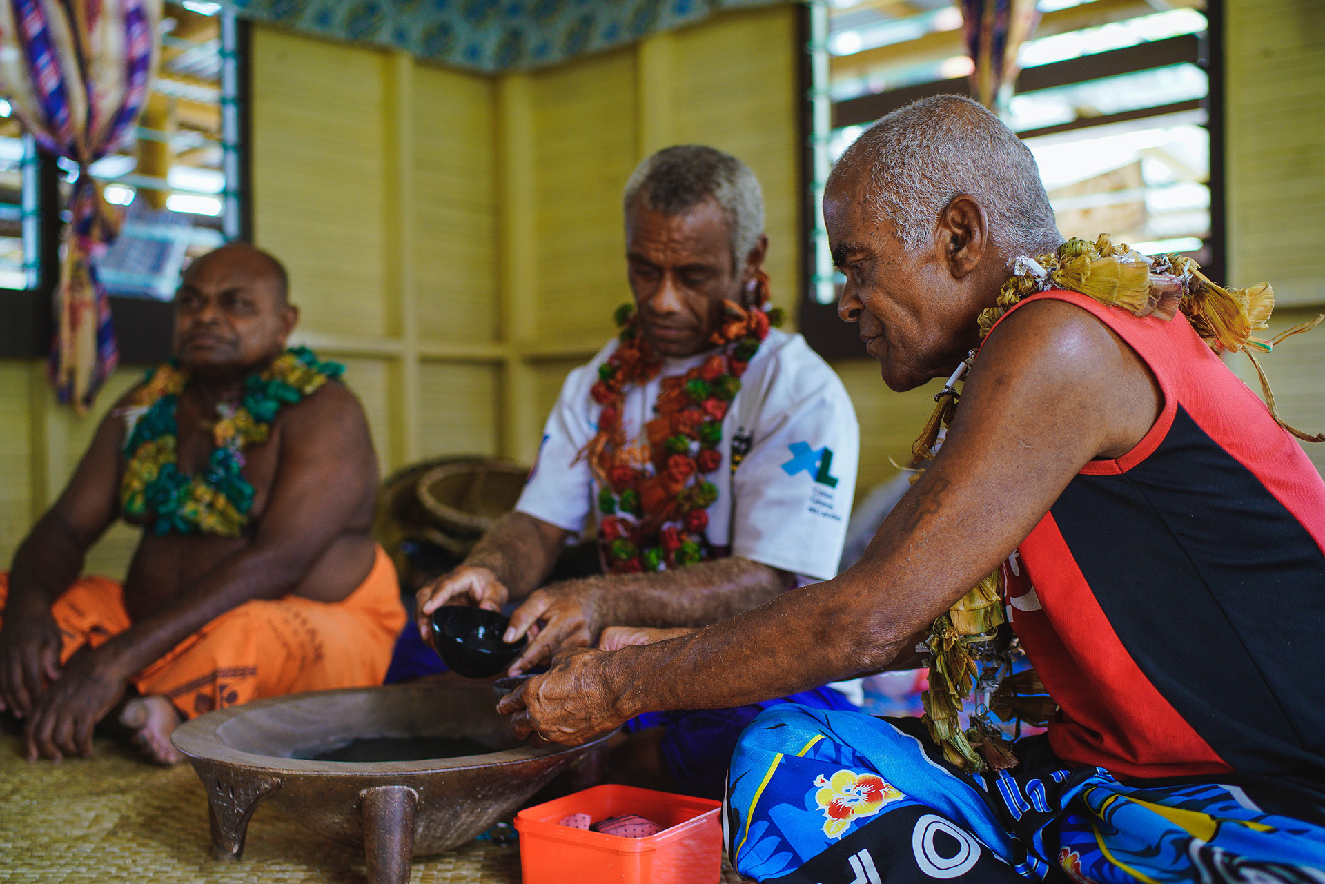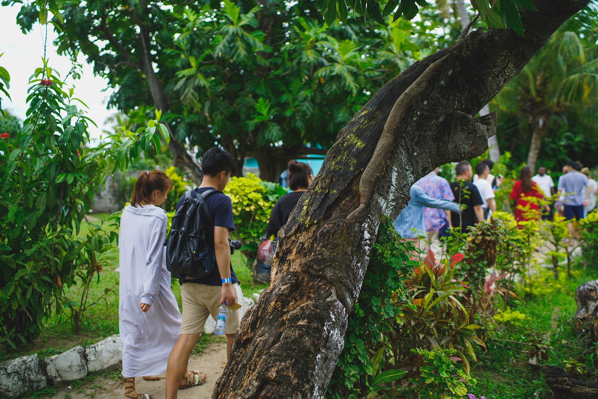 登岛,先拜访酋长长老。有意思的是,三个人都光着头,虽然分不清谁才是酋长,但明显他并没有刻意彰显自己戴帽子的特权。酋长和长老为我们举行了欢迎仪式,举碗劝饮,碗中是用传统方式榨取的植物浆液,从一个漆黑的大铁盆里舀出来,色浊而味淡,不知道是哪种植物。女士们都喝得有些勉强,蹙眉掩口,如果能过滤一下应该就容易多了。