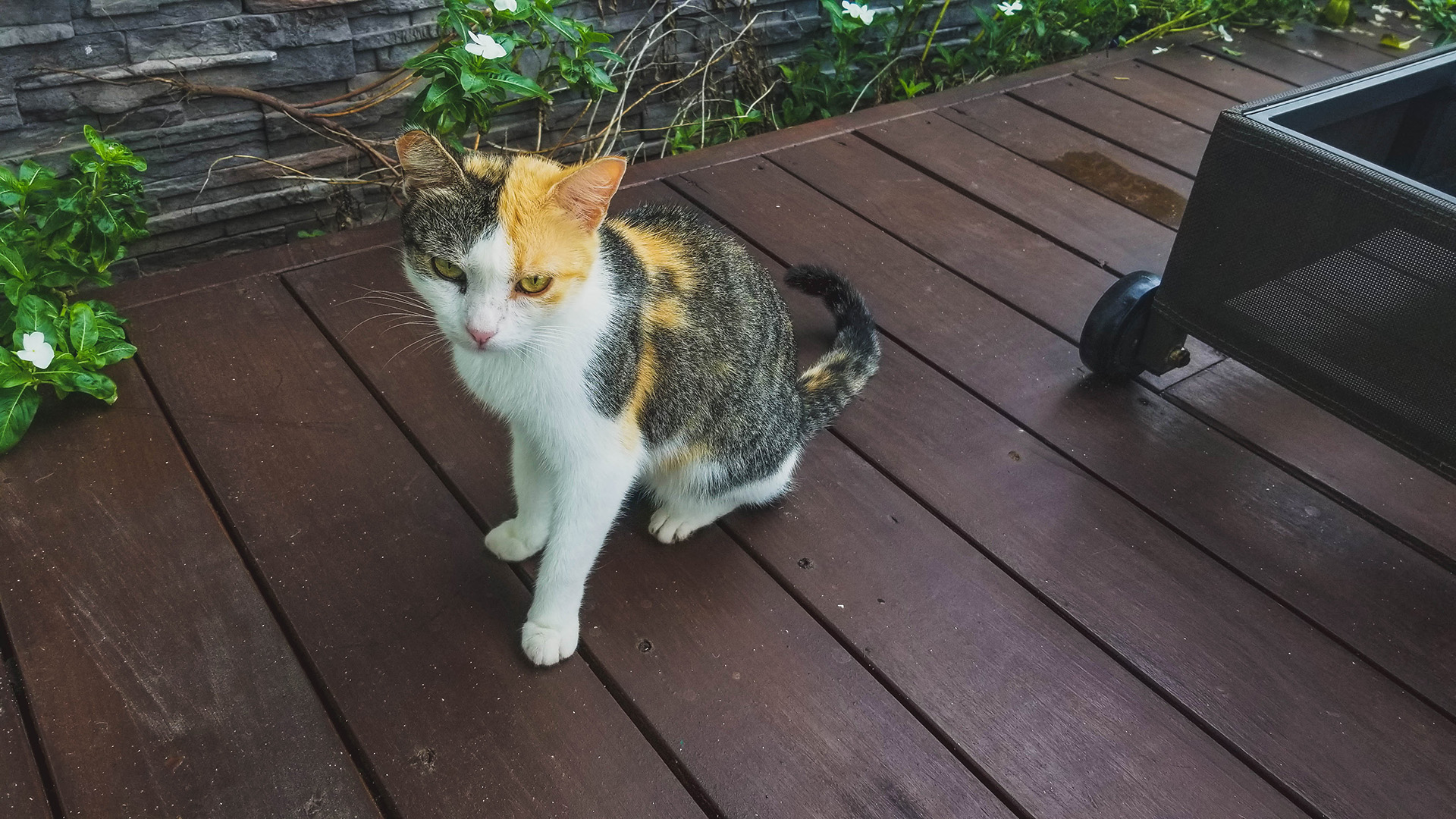 盥洗毕,坐在露台上,一只小猫施施然而至。摇摇手指,马上过来,摸摸背,喉咙里发出一阵呜噜呜噜的娇鸣,一打滚便躺在地板上了。揉了揉肚子,伸腰,展腹,再爬起来绕着我的小腿蹭了蹭脑袋,十分昵人。