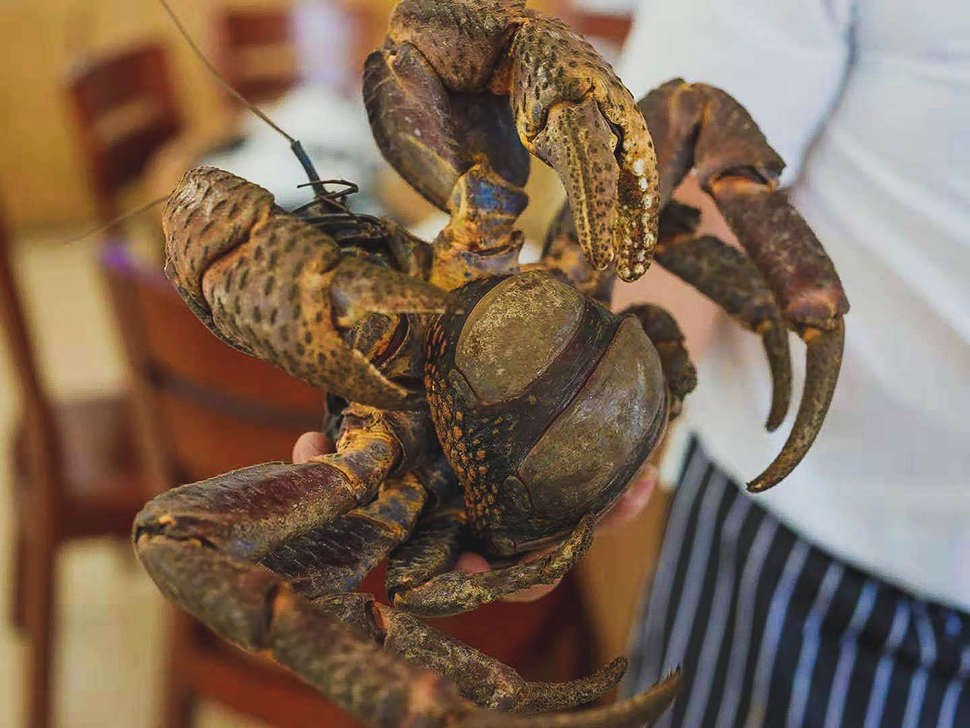 服务生特地抓了两只活的椰子蟹出来,硕大如盘,触须皆戟指,放置于地,张鳌横行,观者辟易。老张说椰子蟹能用鳌夹开椰子,取食椰肉,威力惊人。所以蟹往哪走,那边的人就尖叫闪避,场面欢乐。