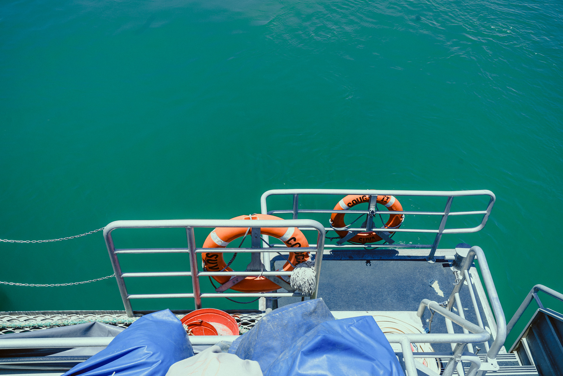 先乘大船出海,至一码头,则换作小舟。小舟航行一小时后,又泊于小岛。岛名 Moruriki,据称即汤姆汉克斯那部荒岛余生的拍摄地。双岛对峙,奇峰并立,风景尚佳,Help Me 文字还镌在沙地上,笔画都不曾乱。