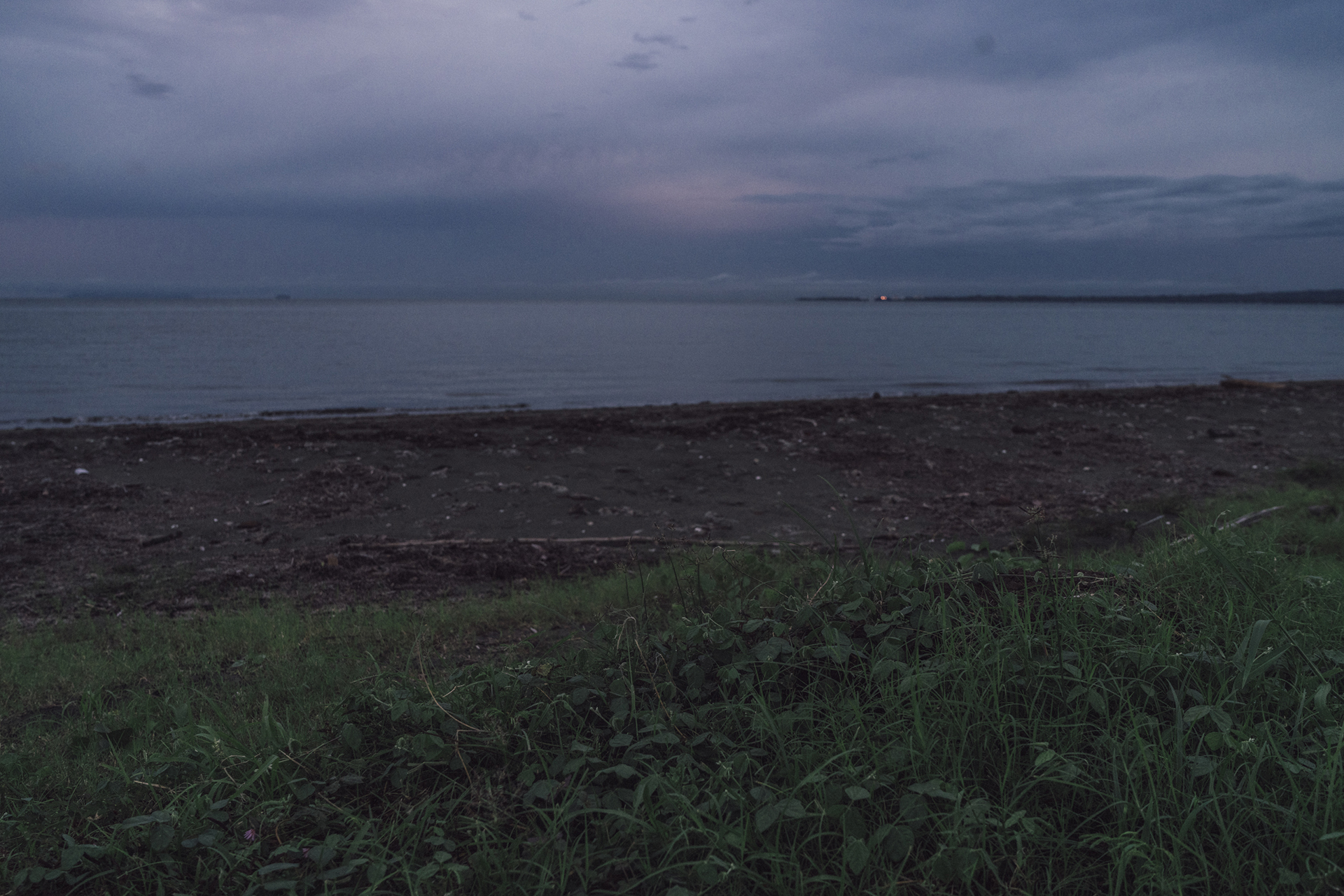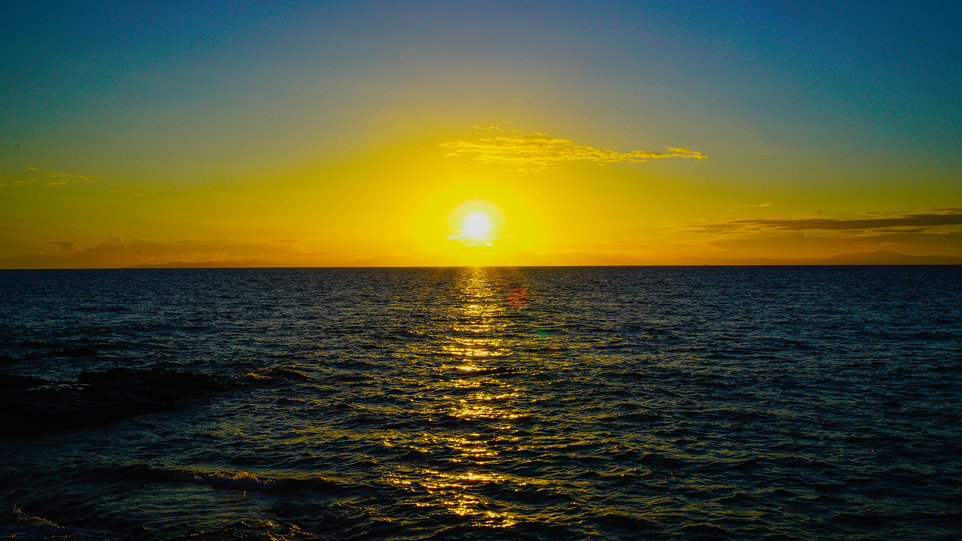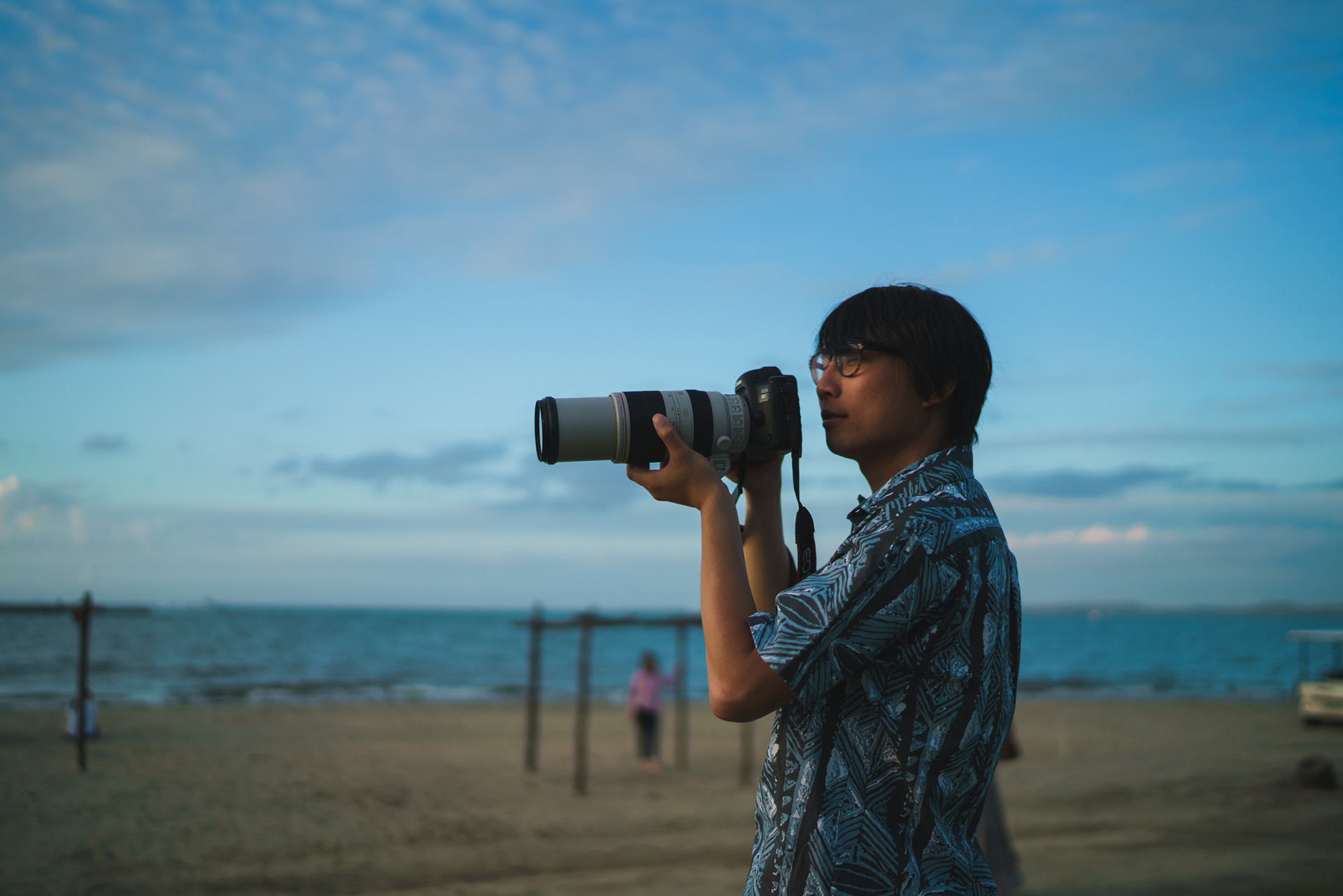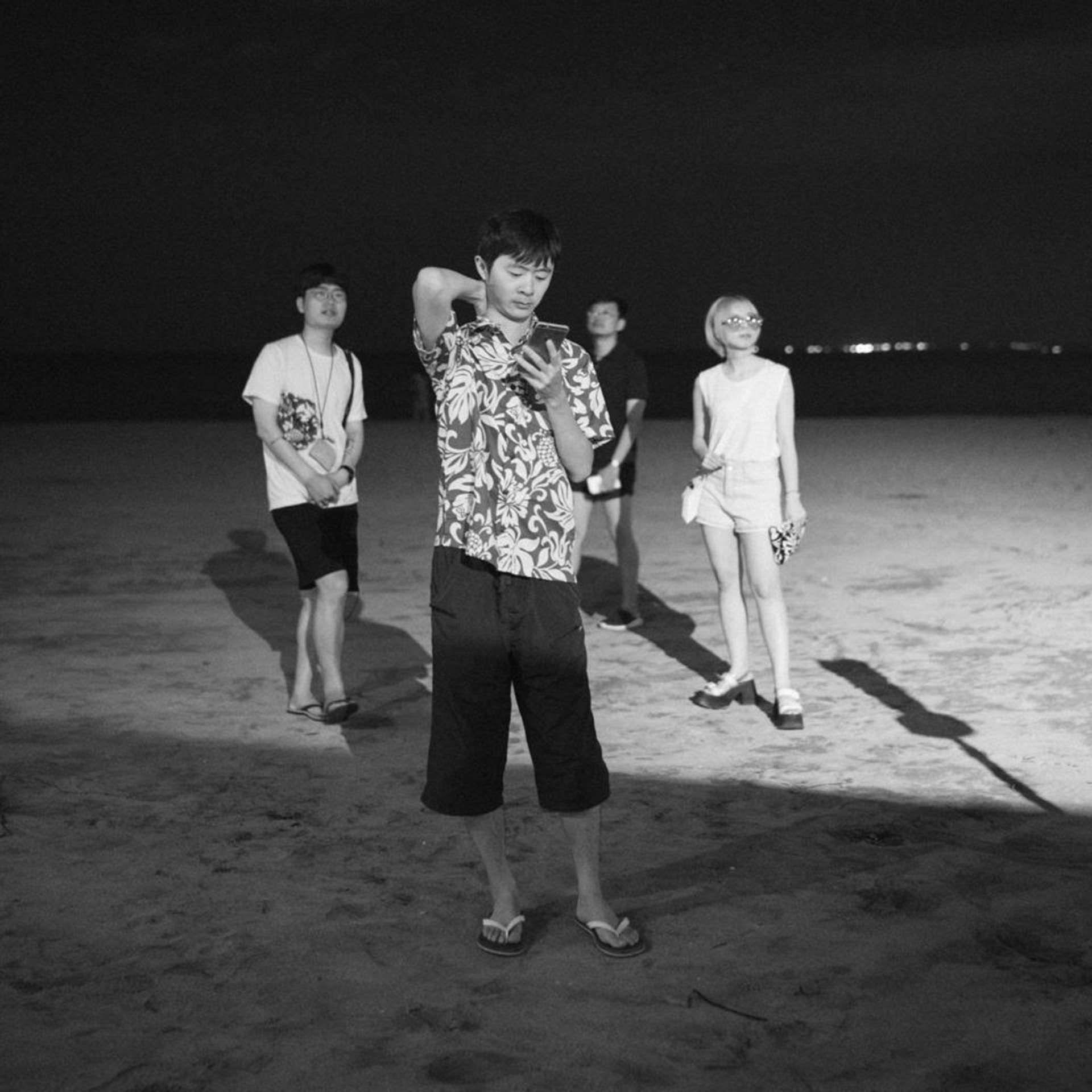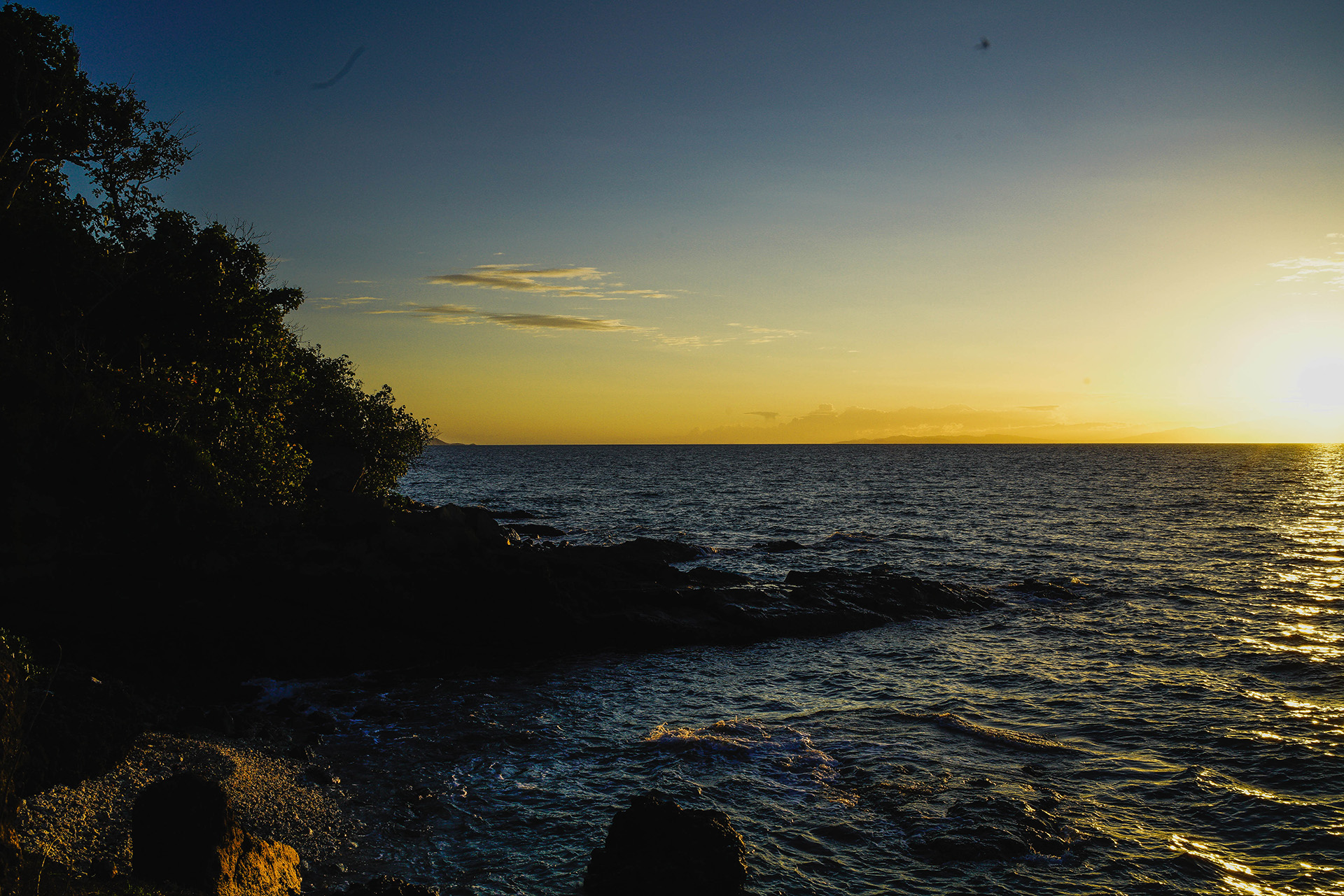 定了五点的闹钟,却毫无知觉地错过了,等一觉醒来,已然是五点半的第二个闹钟。推开门,晨风犹凉。往东望去,被山崖所阻无从窥见,但西南方已是彤红微露,再不出门便迟了。恰好看见海滩上两个人并肩同行,正是汁哥与裤子,打声招呼,不暇盥洗,拎起相机赶紧追了上去。