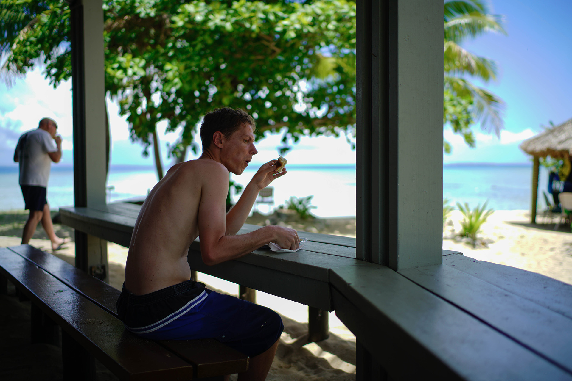 吃完饭,便等着前台通知领房间钥匙,然而一直等到三点多,仍是了无进展。期间好几次没撑住,昏沉沉差点睡去。在吧台点了一支斐济当地产的啤酒,辛苦少回甘,喝完了便倚在露台躺椅上,这次倒睡着了,口涎横溢。不料天公也不作美,晴雨无常,不一会便被小雨打醒。