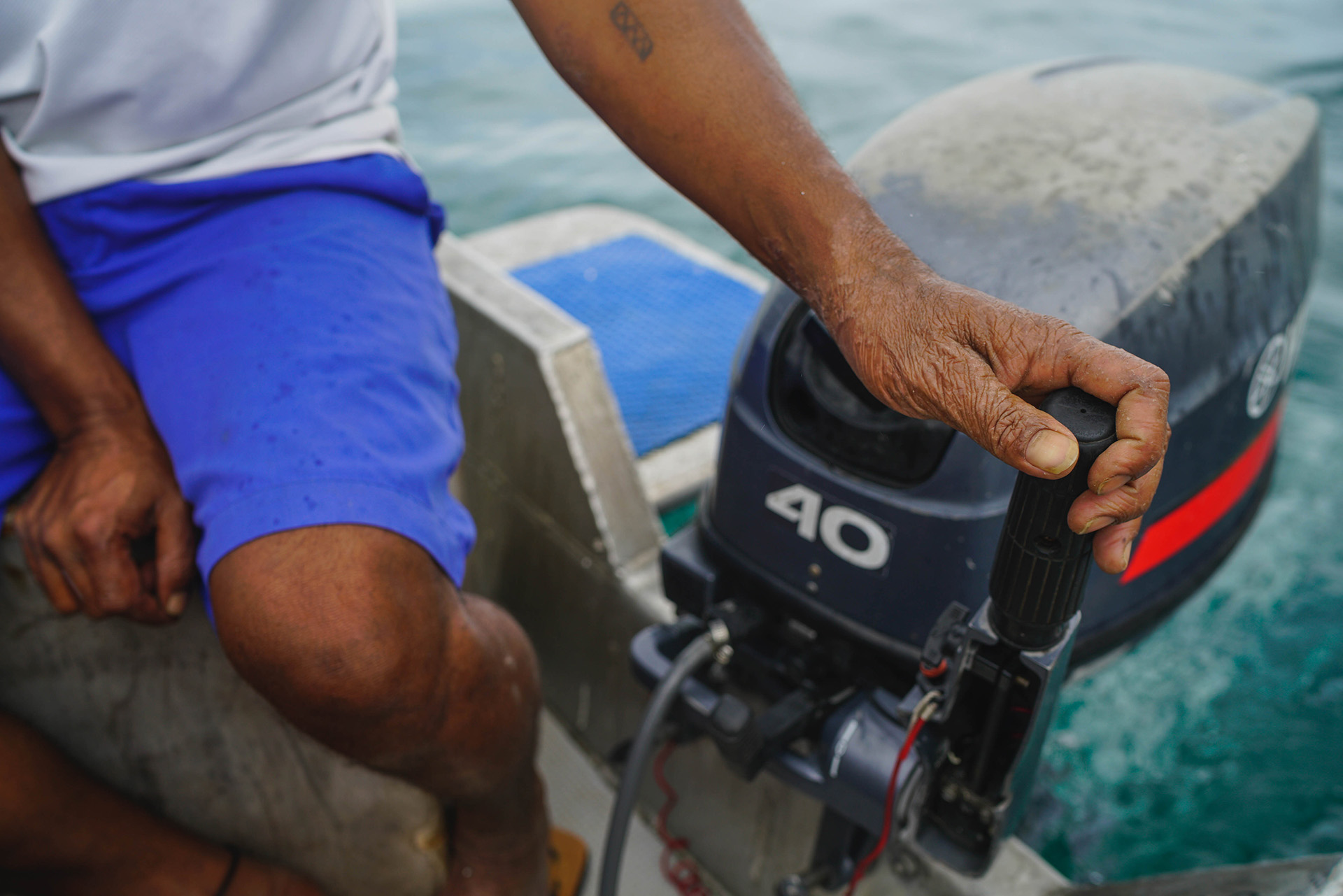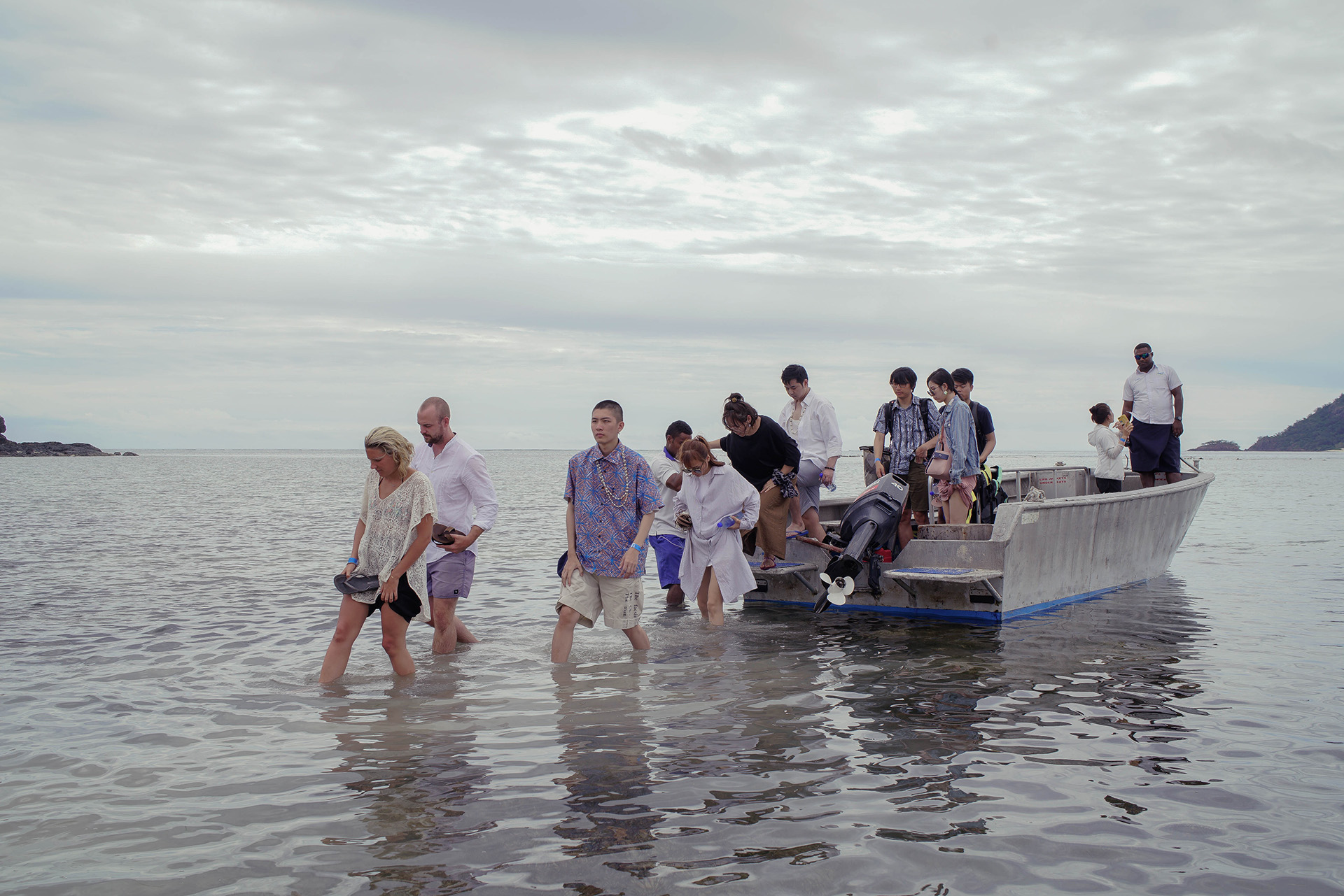 我们要去的 Tokoriki 便是这班航线的第一站,大约一小时航程。酒店没有码头,大船离岛数百米,便有小船来接驳。摇摆着跨过船舷,瞥见两船之间荡漾的水波,不由一声惊呼:好漂亮的蓝!