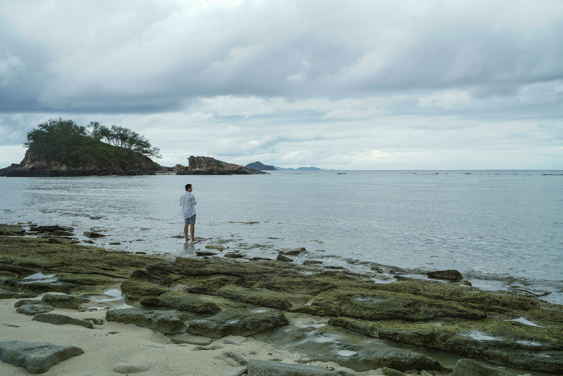 好不容易找到一片沙滩,已经身在小岛的北岸,看上去和酒店前面的沙滩差不多面积,而砾石更多,想必是没有开发的缘故。四顾沙砾荒芜,杳无人迹,山林寂静,不通蹊径,惟海风吹鬓,狂潮上下而已。