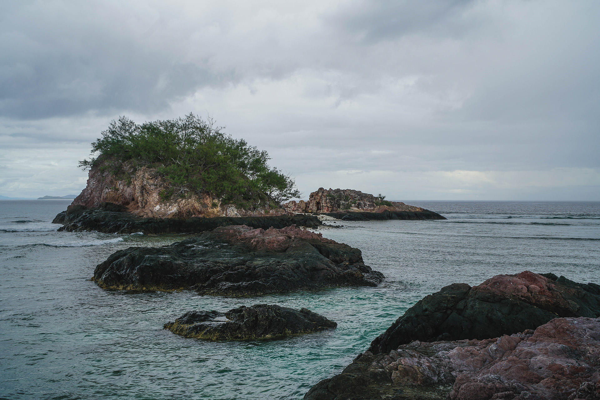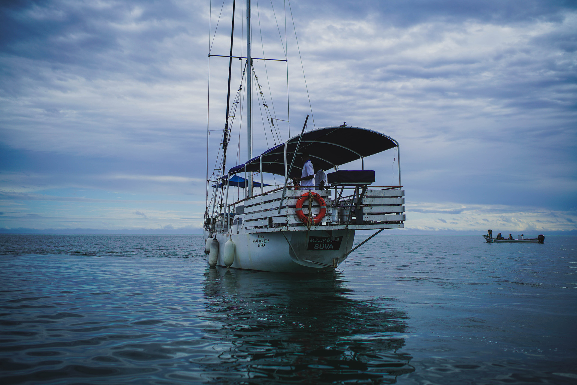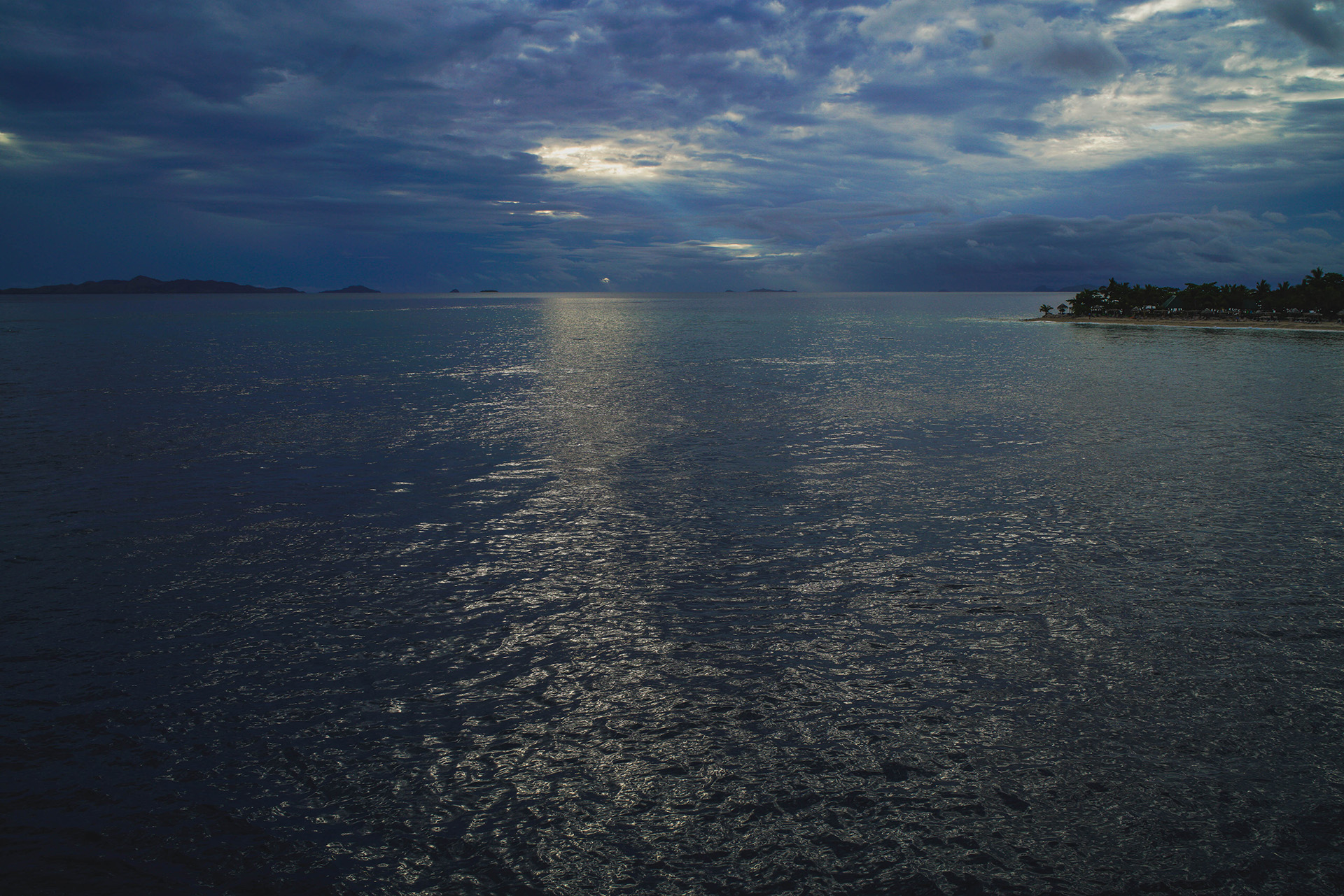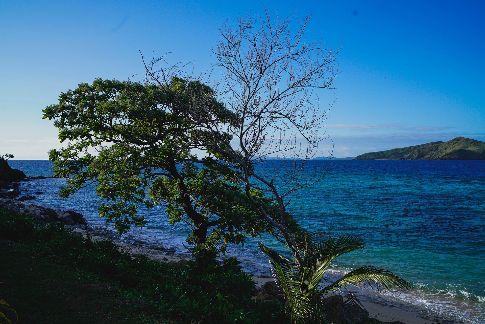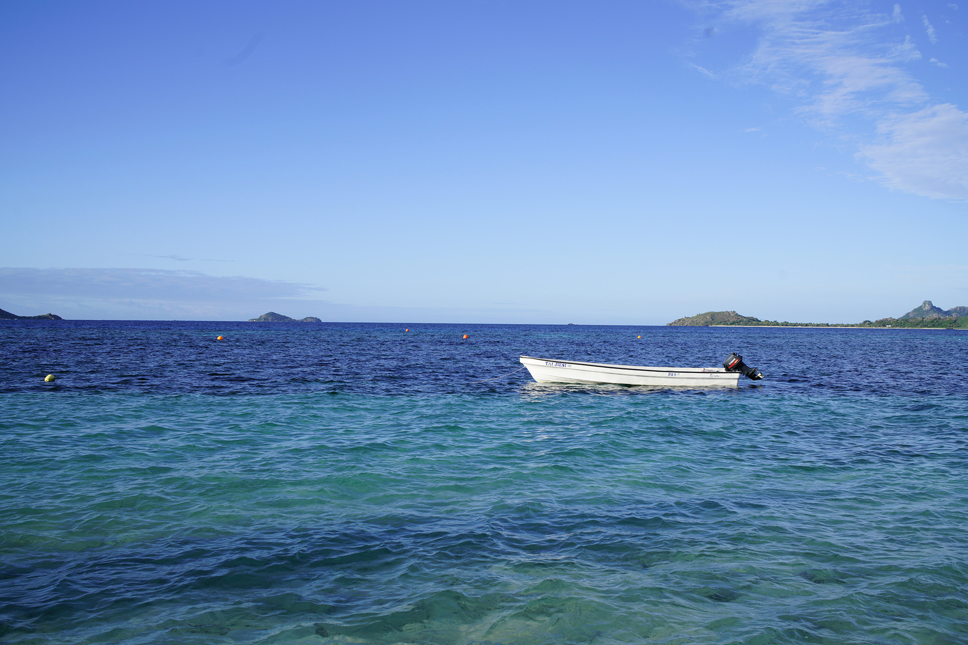 初出 Denarau 码头,海水是有些浑浊的碧绿,船行渐远,水色渐深,渐而变成了黛蓝。驶近 Tokoriki 岛,即转为清澈的绀蓝,距沙岸数十米,又变得更清浅了,是充盈着透明感的青绿。水底白色的沙粒和贝壳一一可见,衬得摇曳的水草都显黑了,那水草细看时,却又是绛红色的。