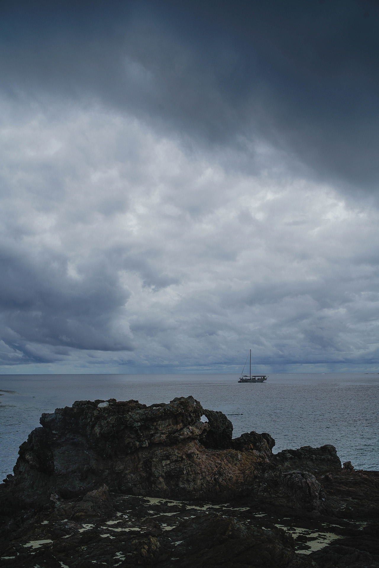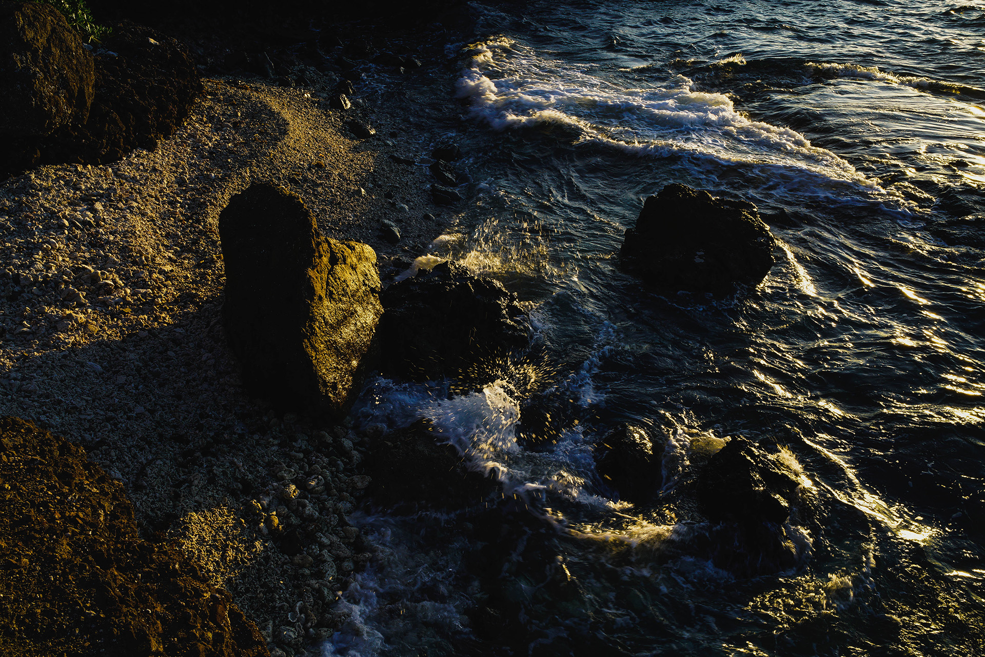 早潮拍岸汹涌,昨天走过的礁石尽皆为浪所淹。从崖底的大石上攀援绕行,海浪从右侧冲过来,余沫带着腥味直迸到肩背之上,鬓发都有些湿。汁哥和裤子性格持重些,便说过去太危险,要不就在这里拍一下好了。剩下我一意孤行,仍溯岩石而上,抓住树干,跳上崖顶草坡,才觉得安稳了。