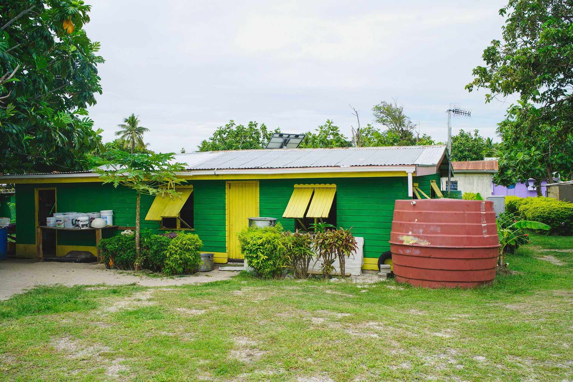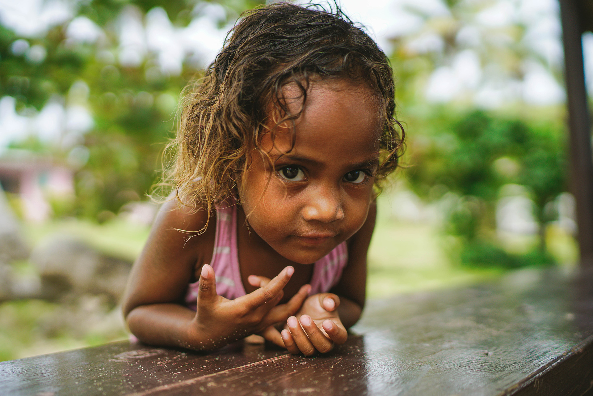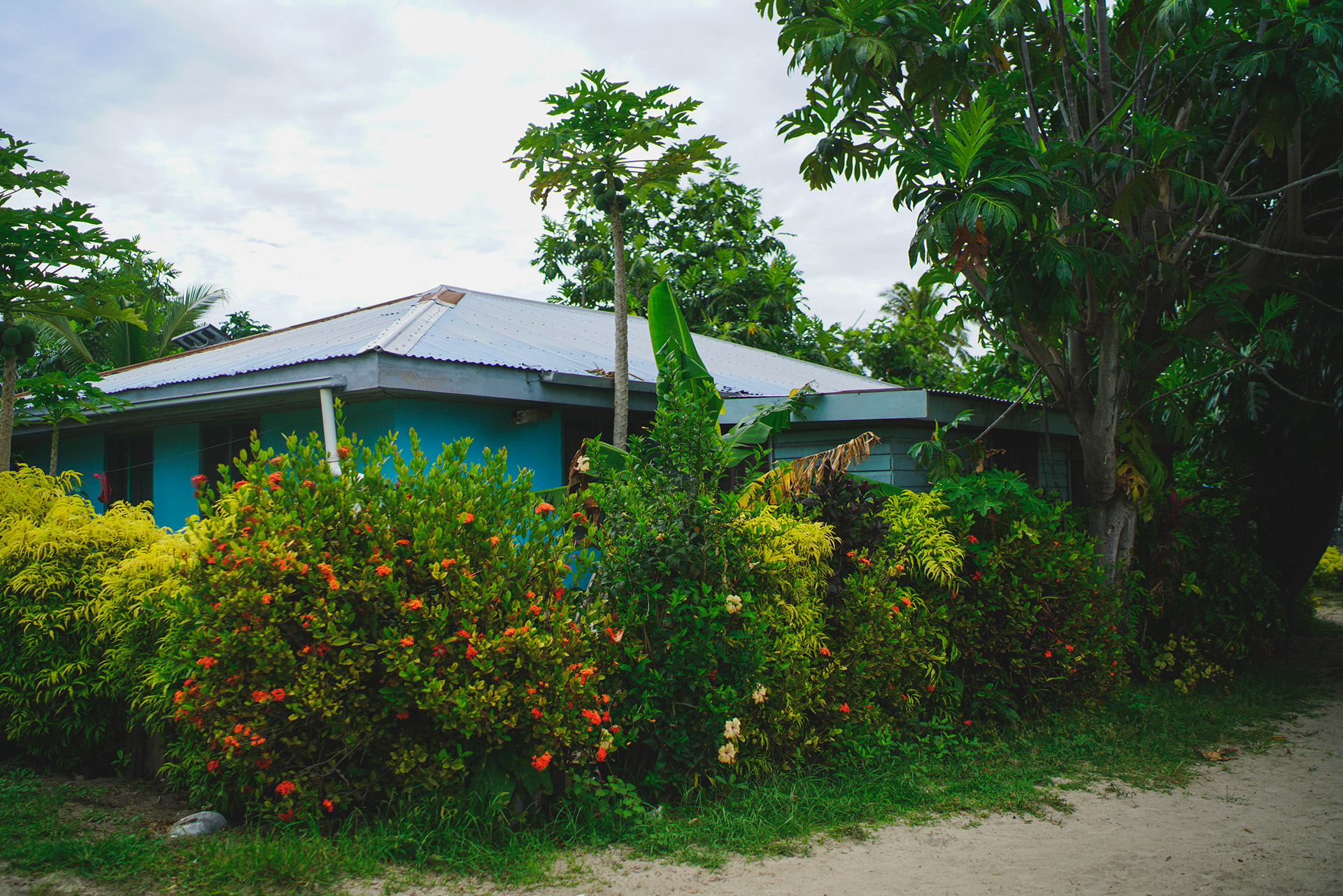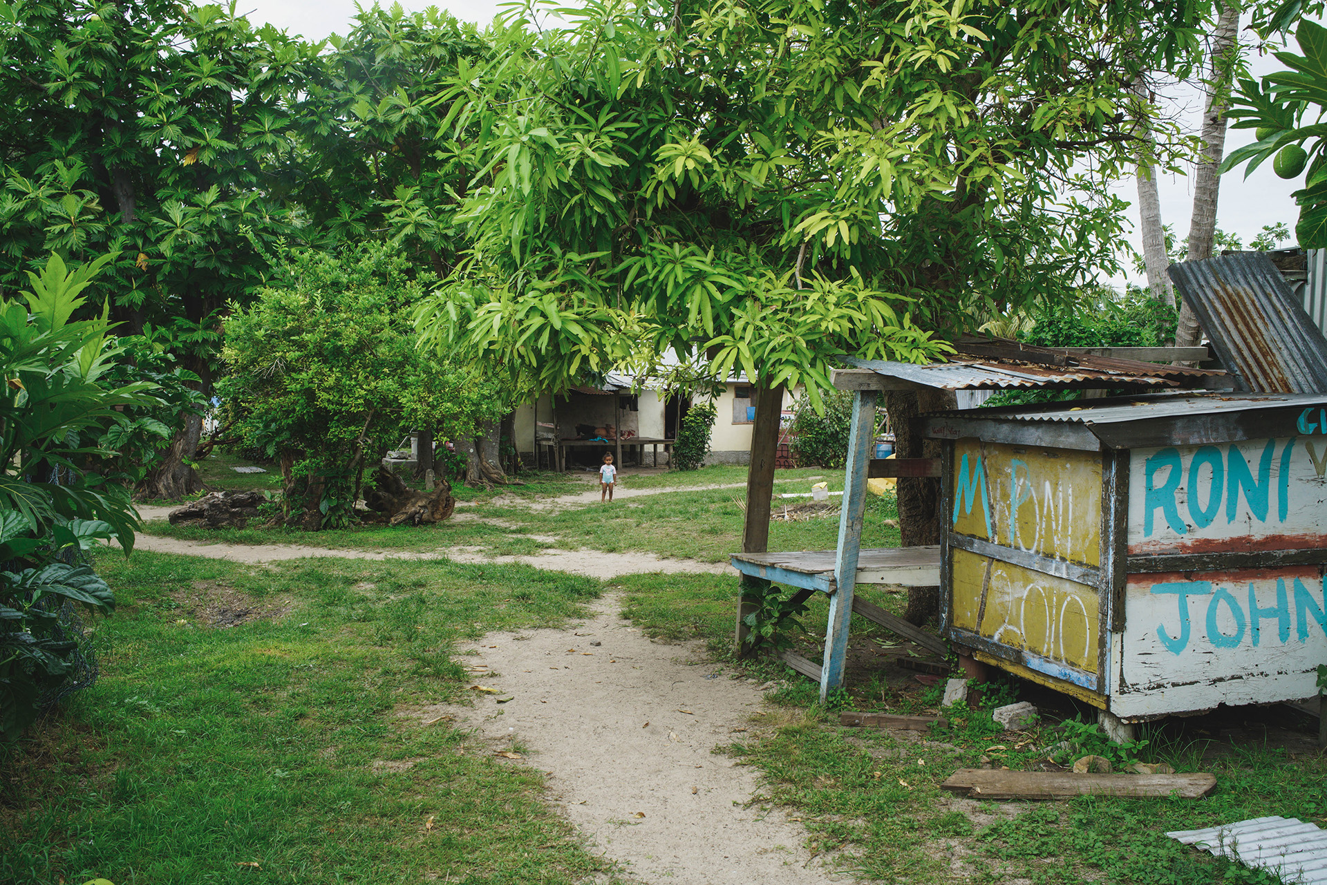 一个小女孩捉到一只寄居蟹,放在长椅上,另外一个更小的小女孩也凑过来玩。虽然有些腼腆,但也一点不怕,眼睛圆而大,目光闪闪,略微有些好奇地观察着我们这些游人。村落中的儿童看见游人非常兴奋,远远地大声喊着 Bula,童音烂漫,天真可爱。