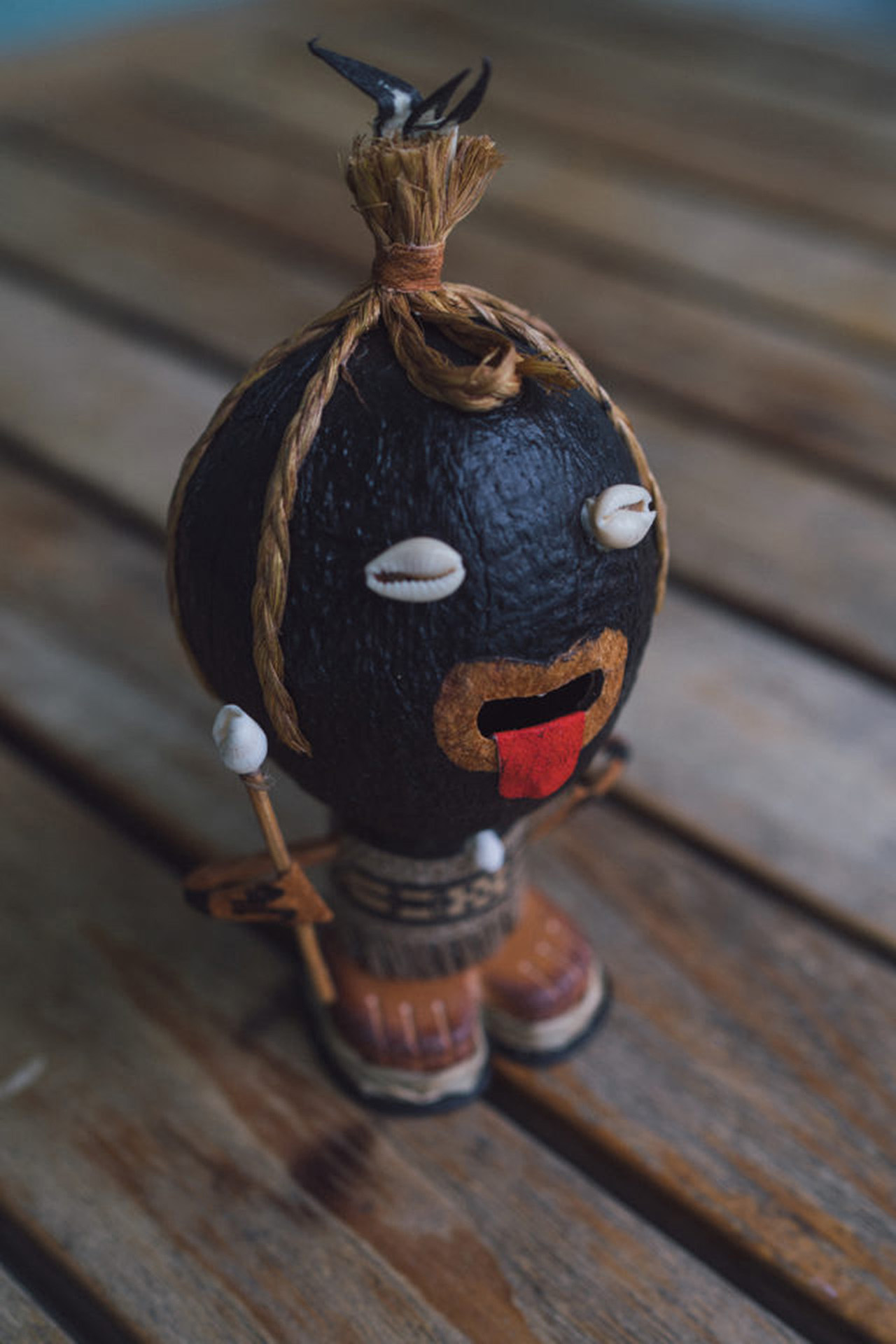 屋外的檐廊下设有简单的市场,所售的物品都有些粗糙简陋。挑拣良久,最后买了一个用椰壳制作的部落战士,辫发散结,吐着一条红彤彤的舌头,看着冥顽不驯的,十分可喜。