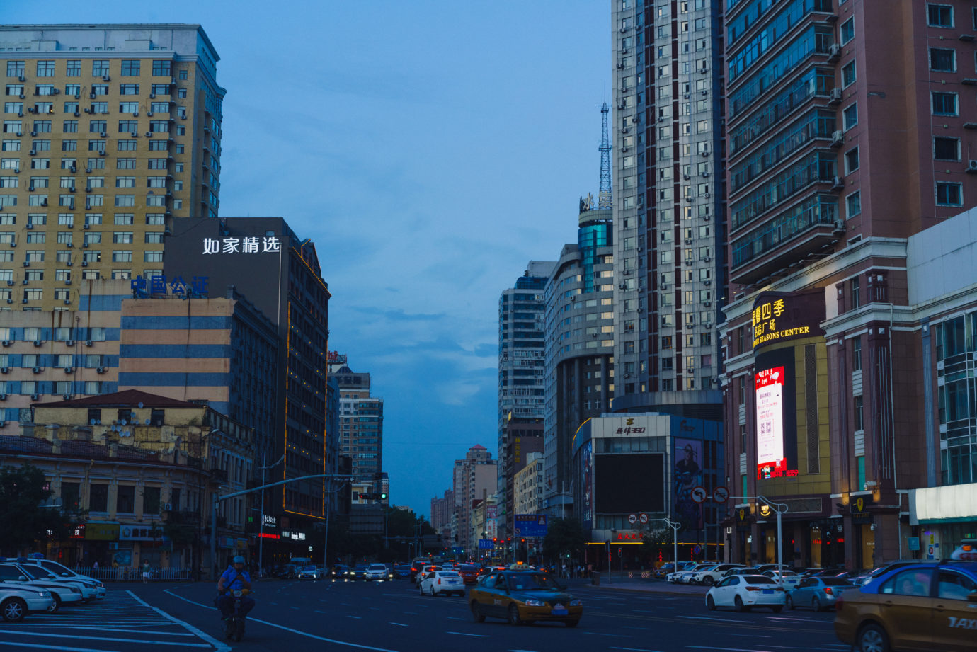 饭毕出门,晚风颇寒,即就路旁店中买连帽衫衣之。然后步行两公里至哈尔滨火车站。中央大街游人如织,出数百步,则暮色笼城,街道萧条,车既稀疏,行人亦寥落,怅繁华之将歇,立回风而踟躇。
