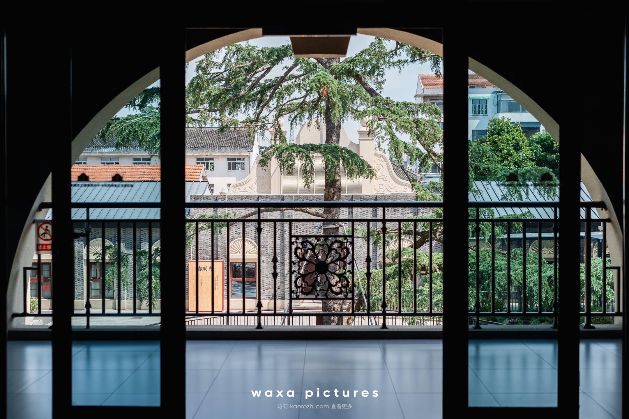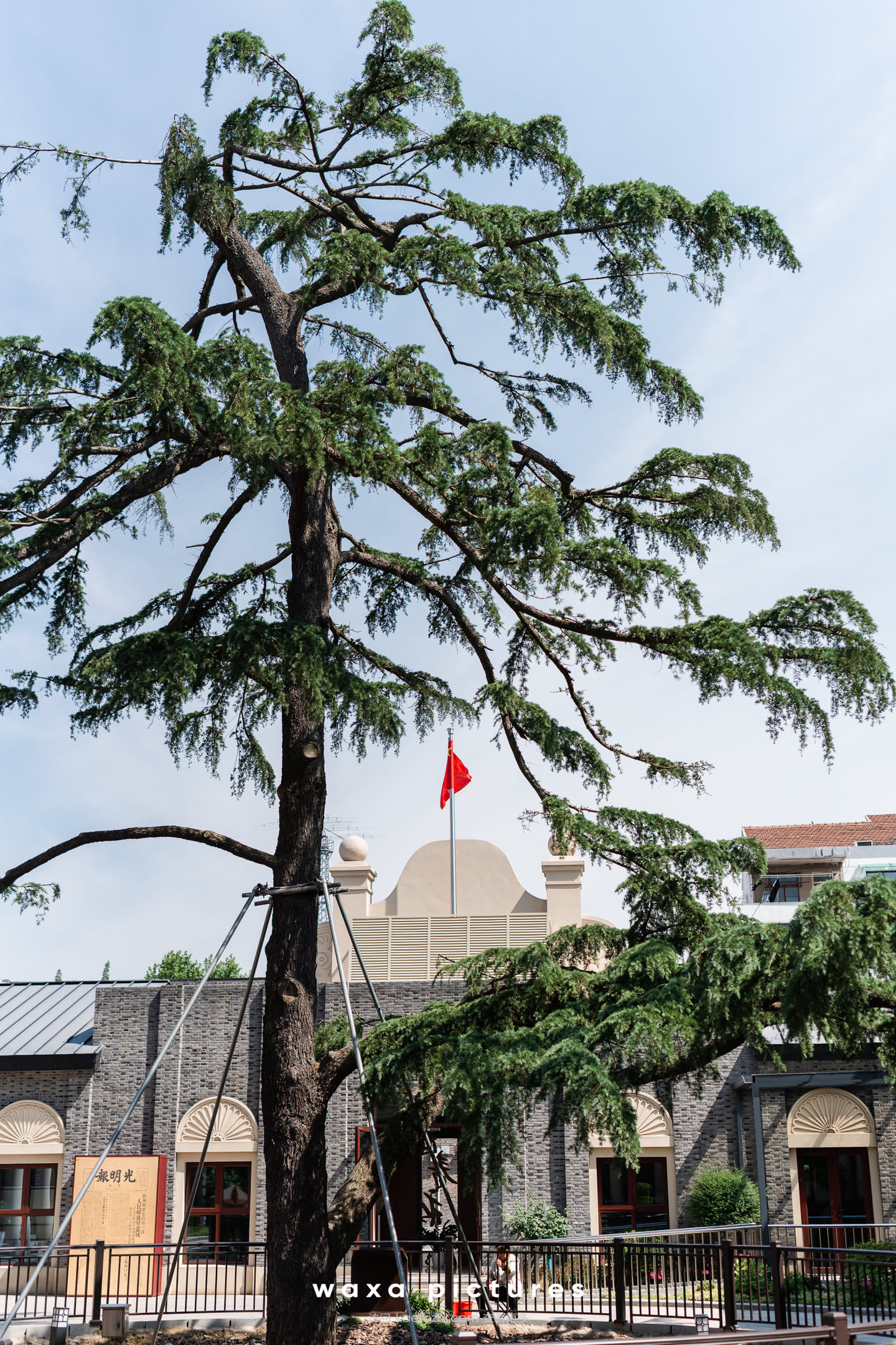 学校规模不大,呈凹字形布局,中庭立着一株巨大的雪松,凌云直上,高出楼顶,主干看起来被截断过,原本可能更高,也不知是出于风雷之力,还是因为人工剪裁。枝干铺开,覆盖了整个庭院。看围栏前的介绍文字,此树已历百年,却毫无老朽的痕迹,却是难得。