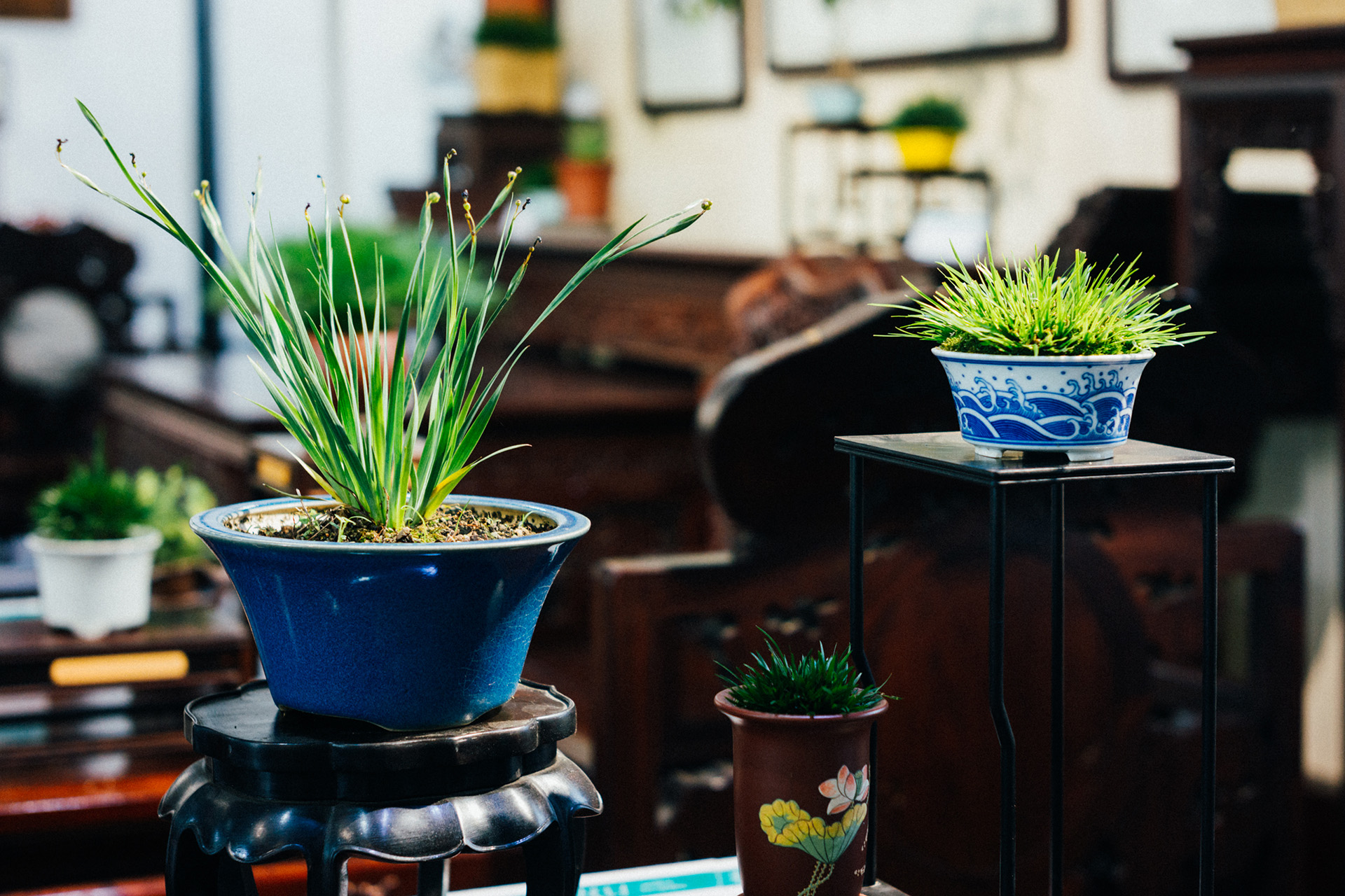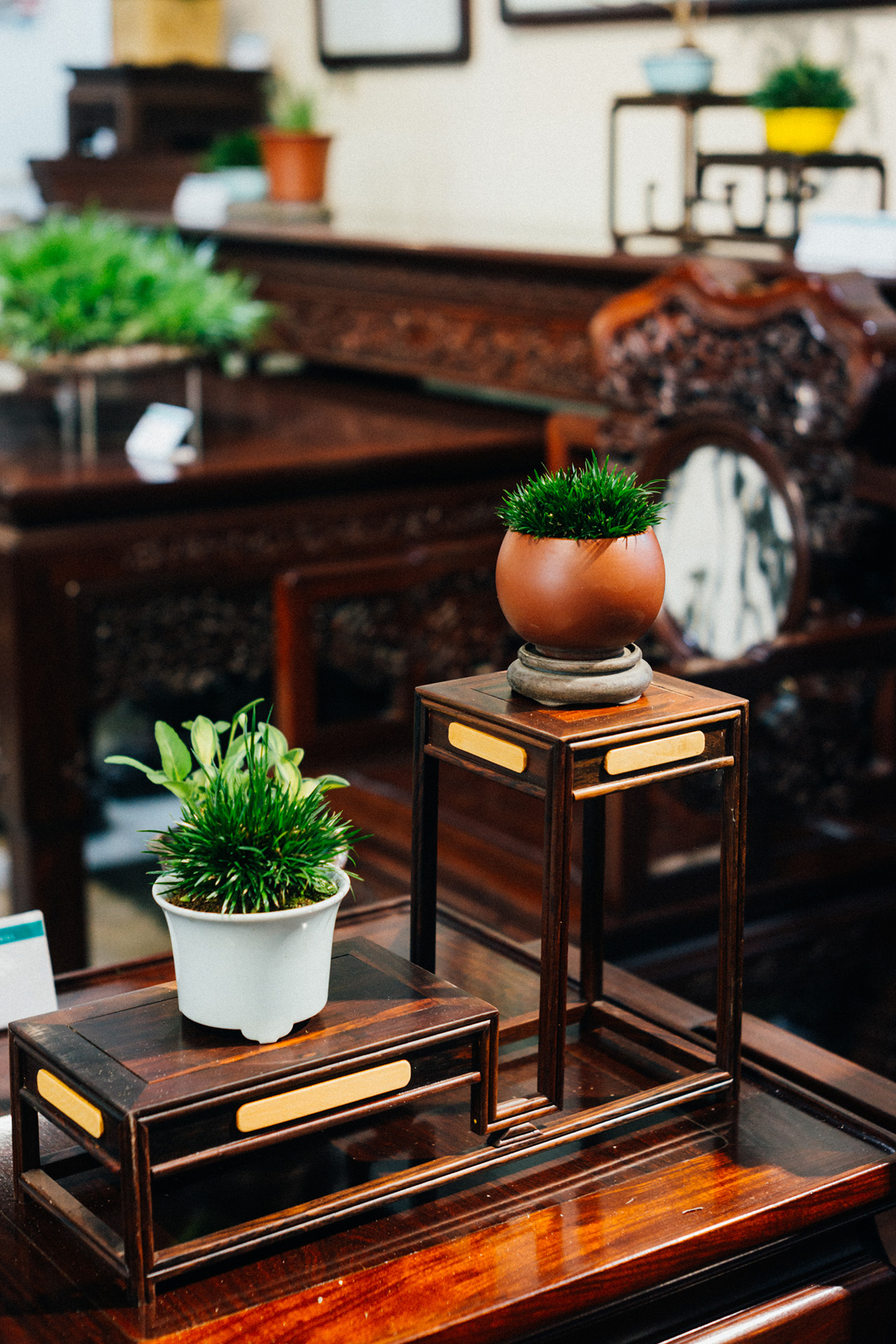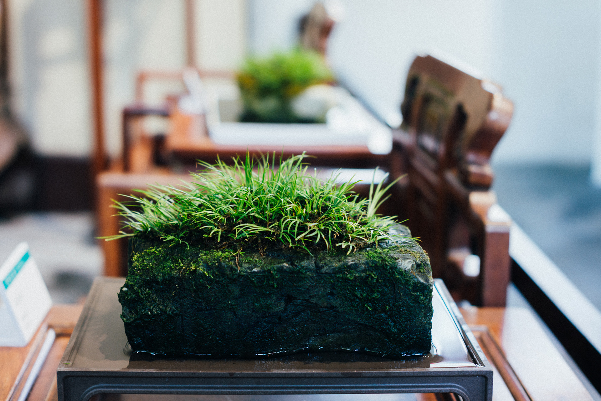 乐知堂内人头涌动,想必都是组团前来打卡的公务员,保安在旁维持秩序,只听他不停劝导:“不能摸呀,这个不好摸的呀。”我凑近去一看,才发现里面展出的是一盆盆极细小的水草,和形状各异的小巧太湖石摆在一起,作为盆景放在台案上。