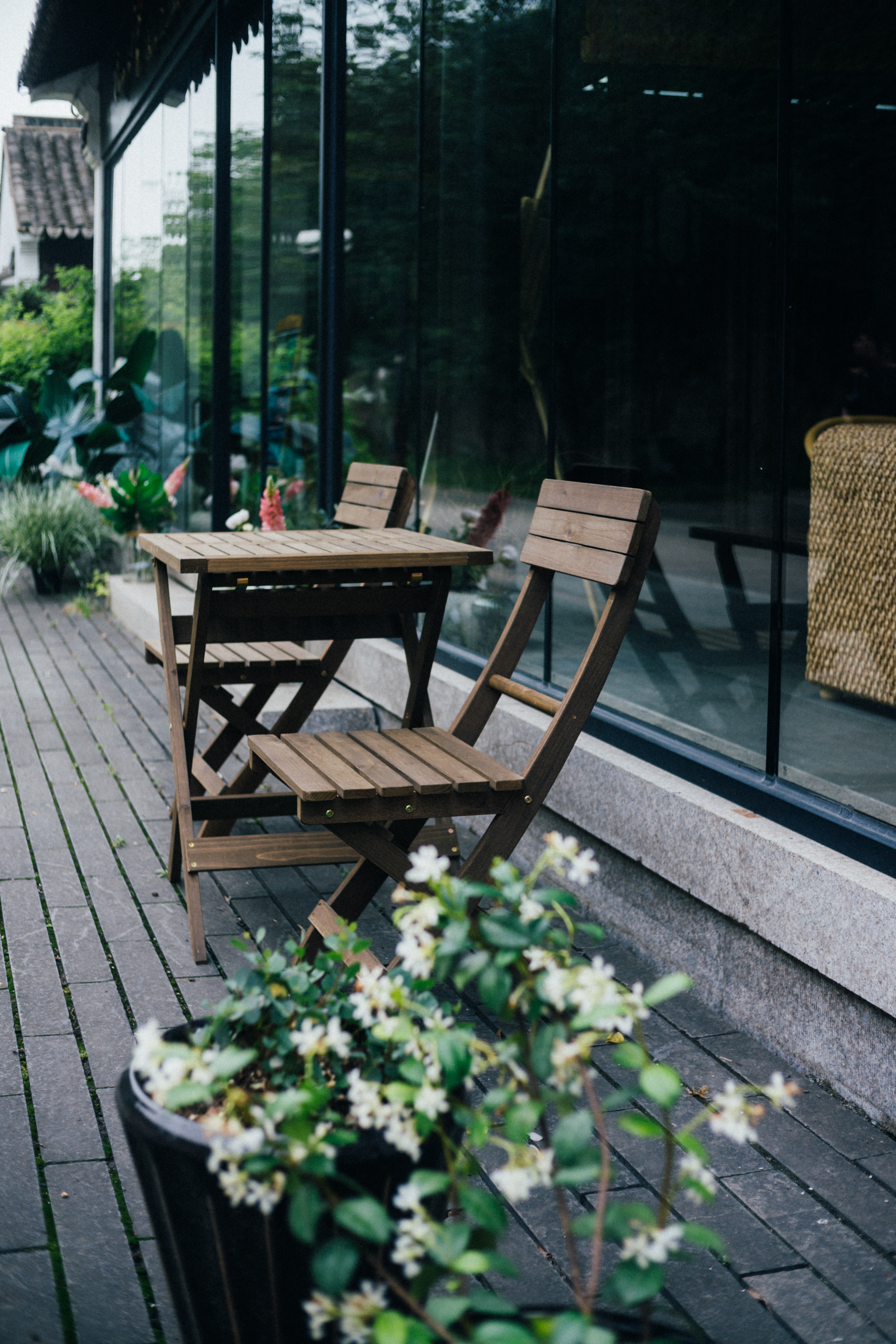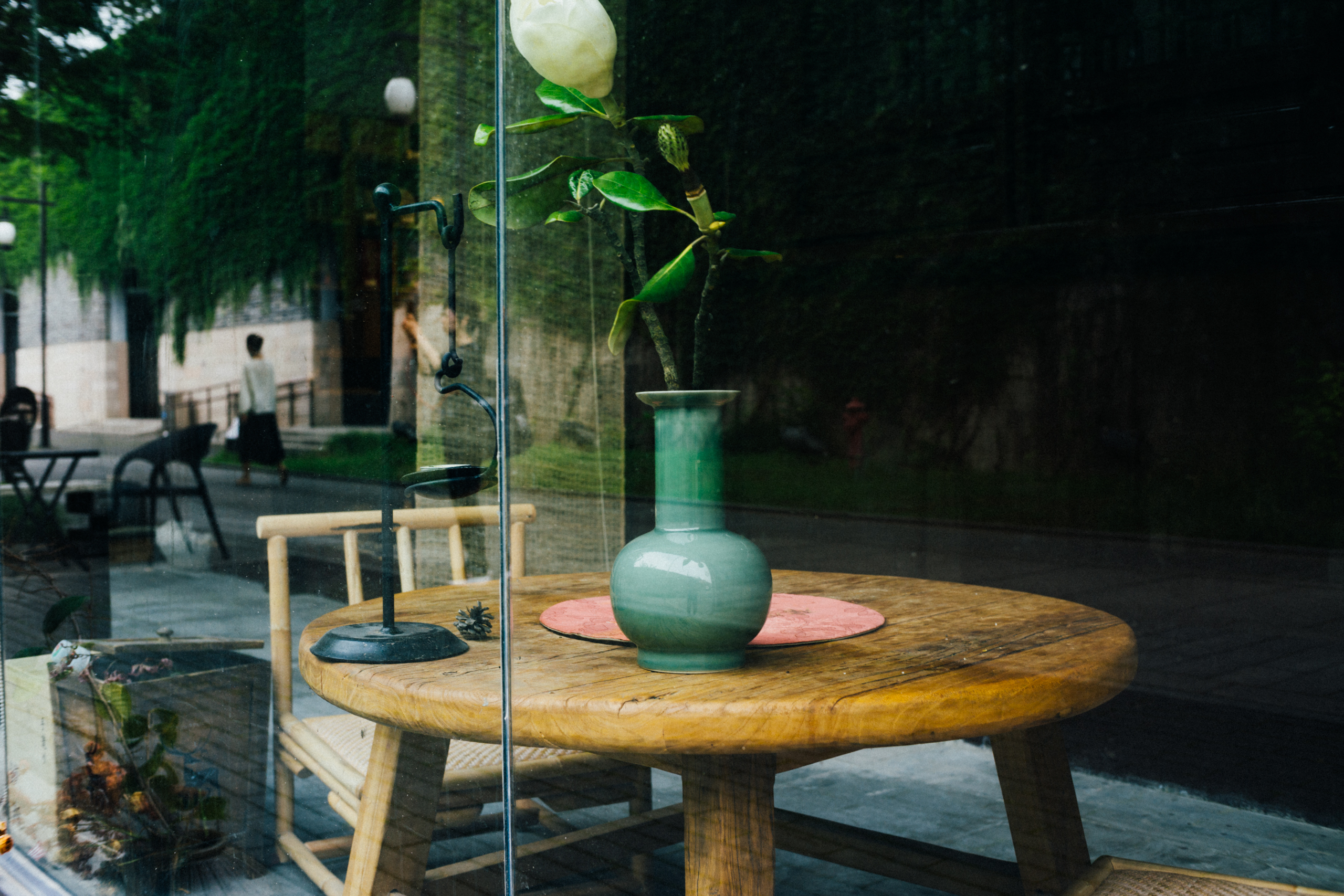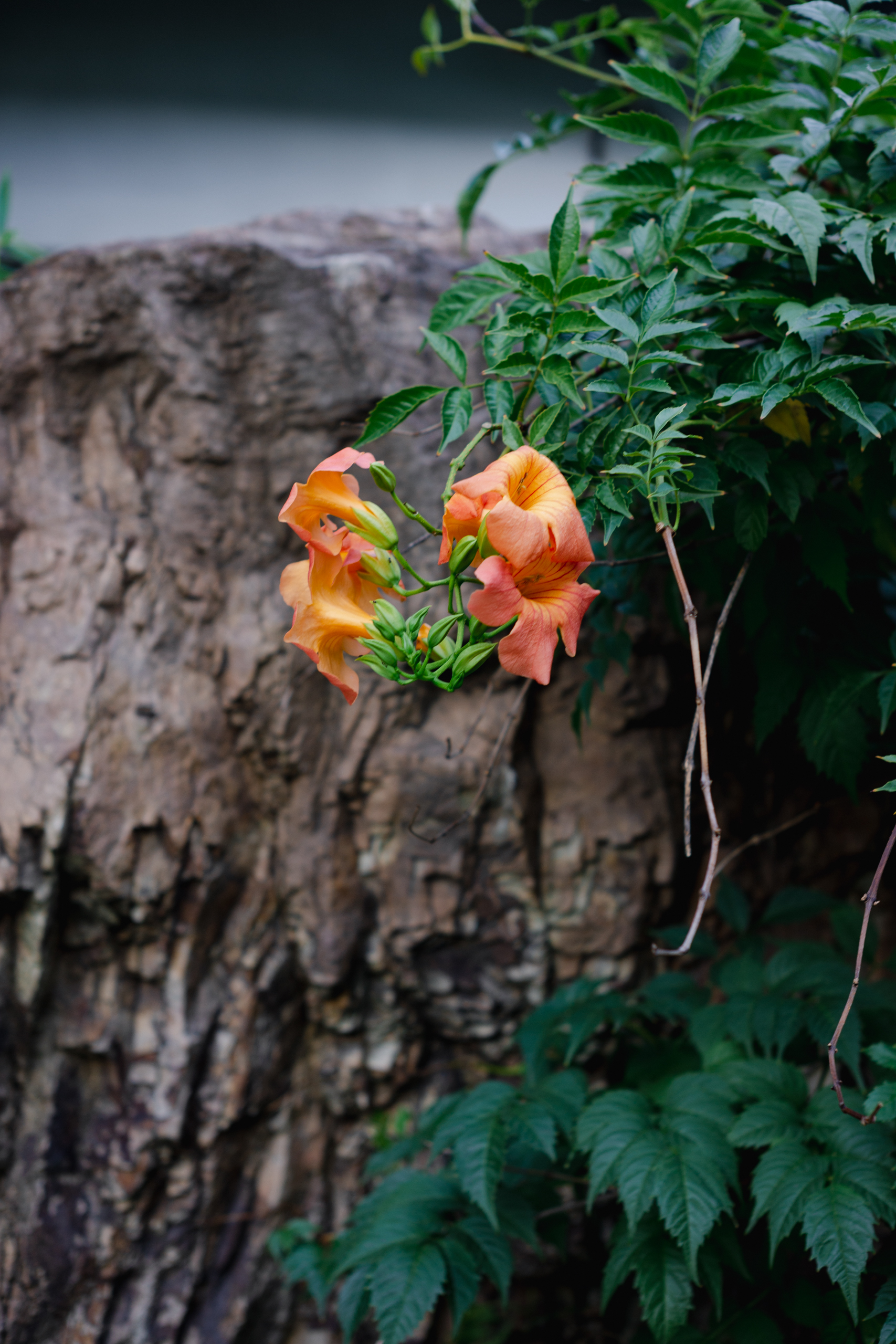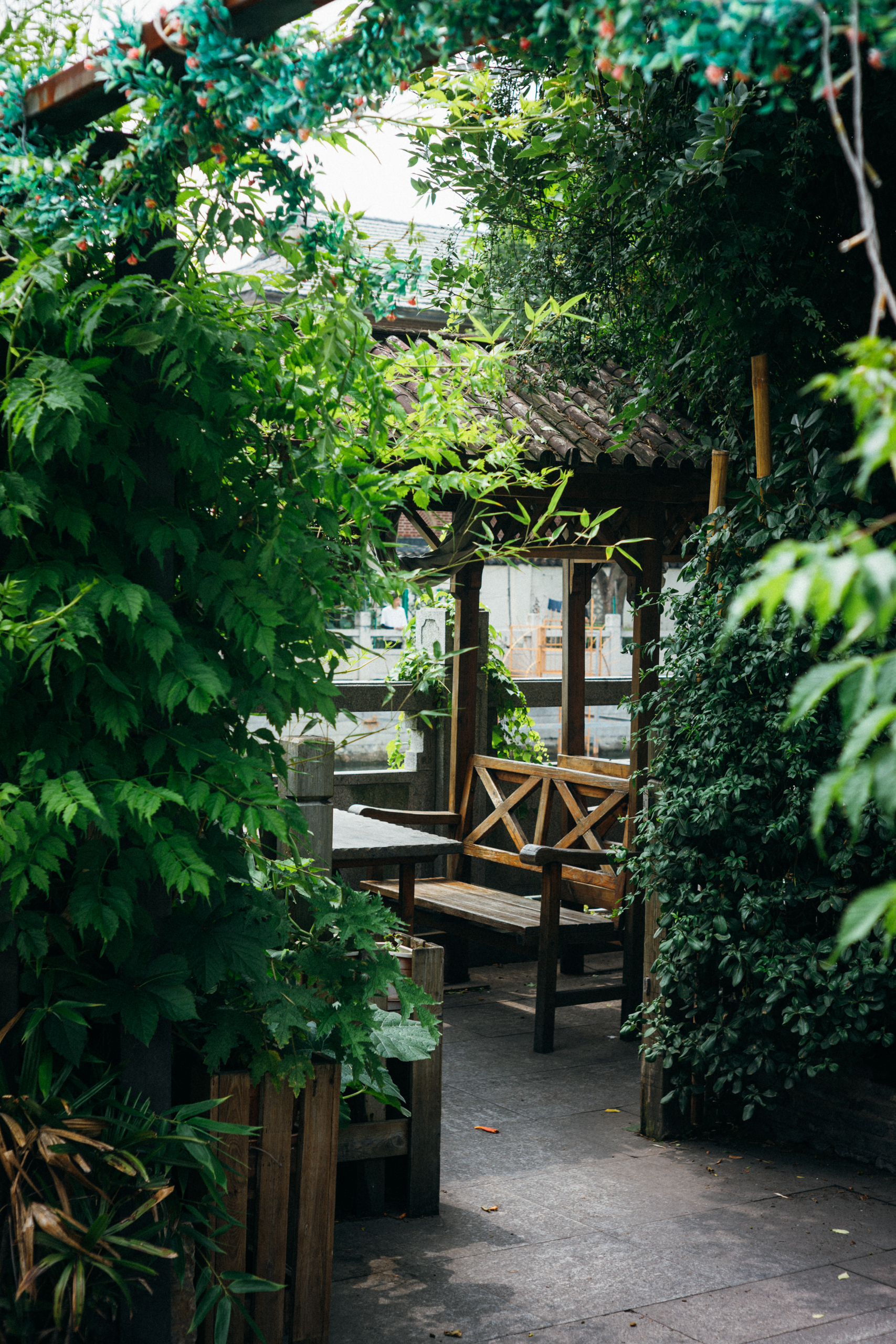 午后炎热无风,树影轻轻颤动,城墙上藤曼滋生,院落的月洞门垂下悄然盛放的凌霄花,偶尔从窗内传出茶客的谈笑之声,随即让位于空气中燥切的蝉鸣。穿行其间,竟凭空生出一种清冷寂静之感。