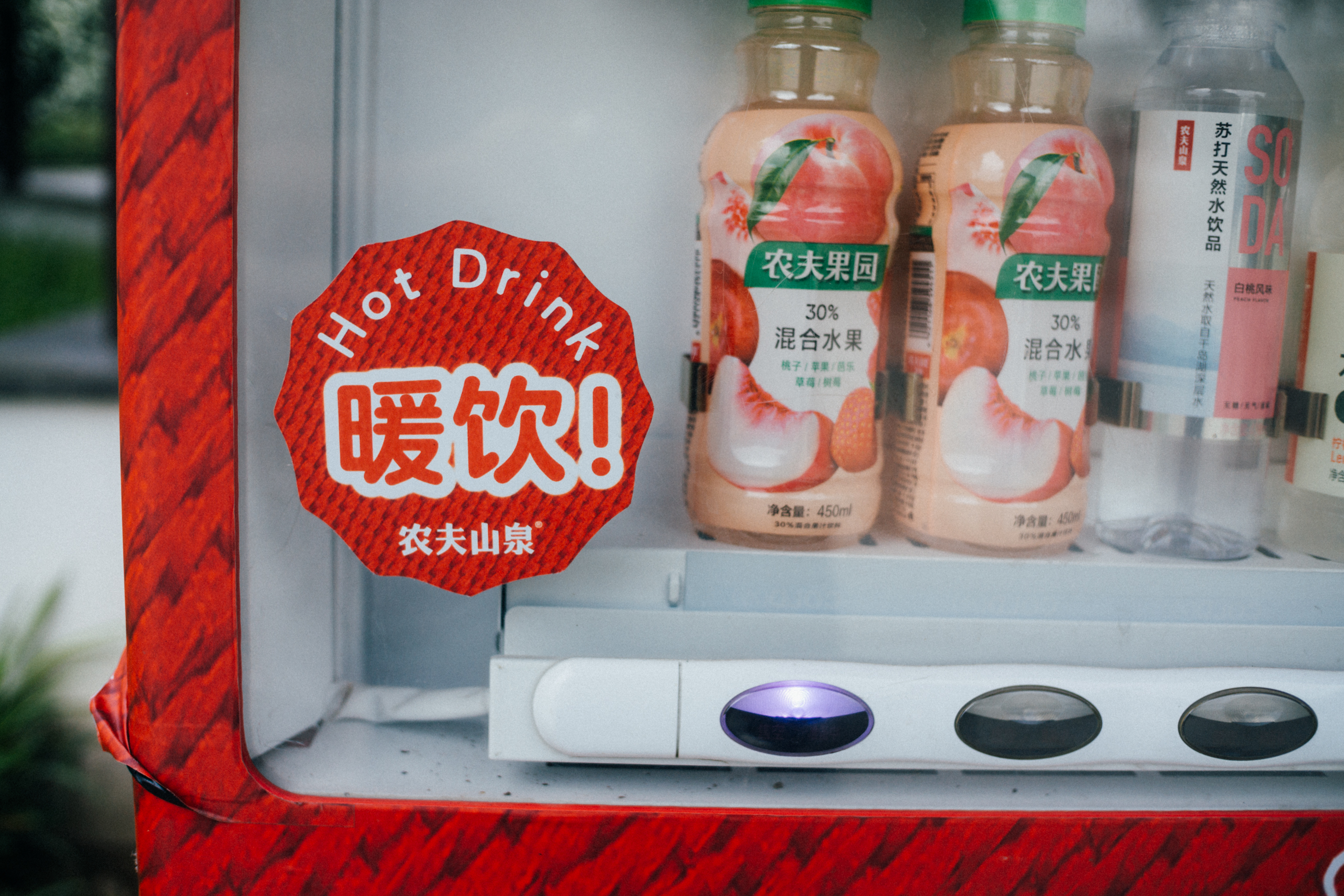 有的售卖机还提供热饮 (不确定是否全部),秋冬之际转凉,健步途中喝一罐热饮,暖彻心扉,多么美好。现在还是夏天,我们就没有尝试了。当然,售卖机的价格比便利店贵,标准的农夫山泉三块钱一瓶,可以参考。