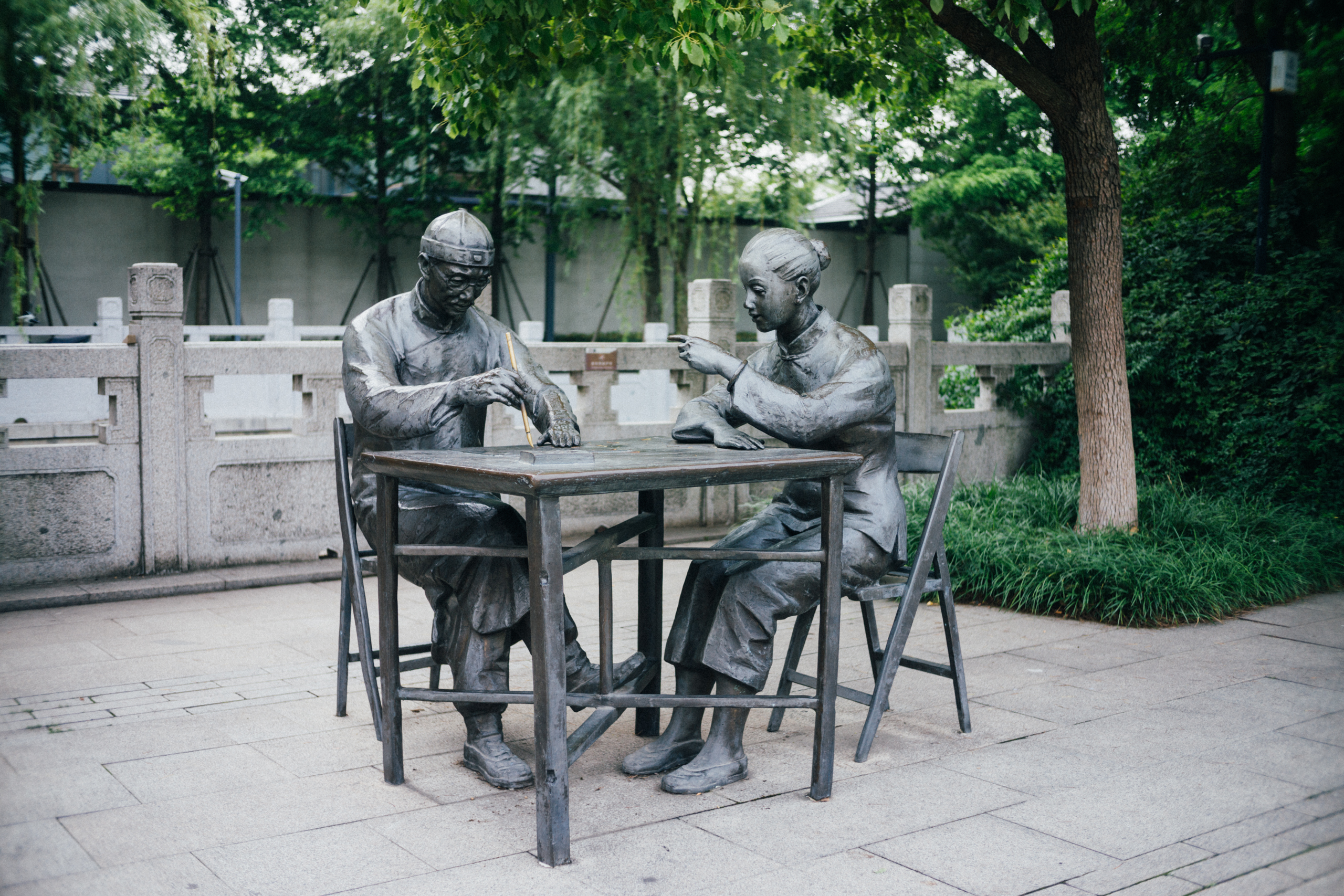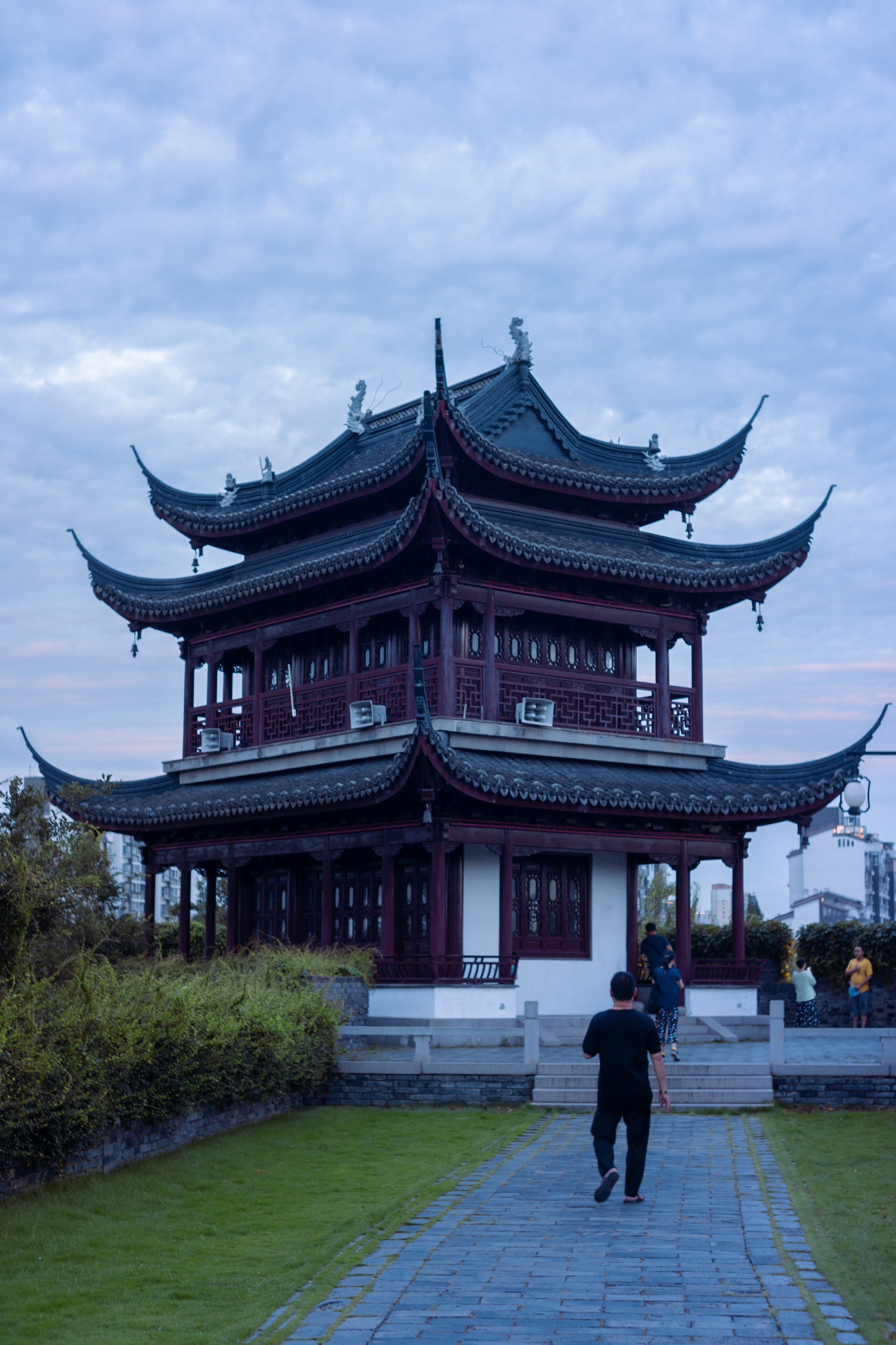 几位阿姨爷叔聚在牌坊下的亭子里唱昆曲,一位阿姨立于亭中,披黑色格子罩衫,系黄色丝巾,举着话筒,咿呀呜呕,声音有些沙哑,唱什么听不太懂,却也别有风味。