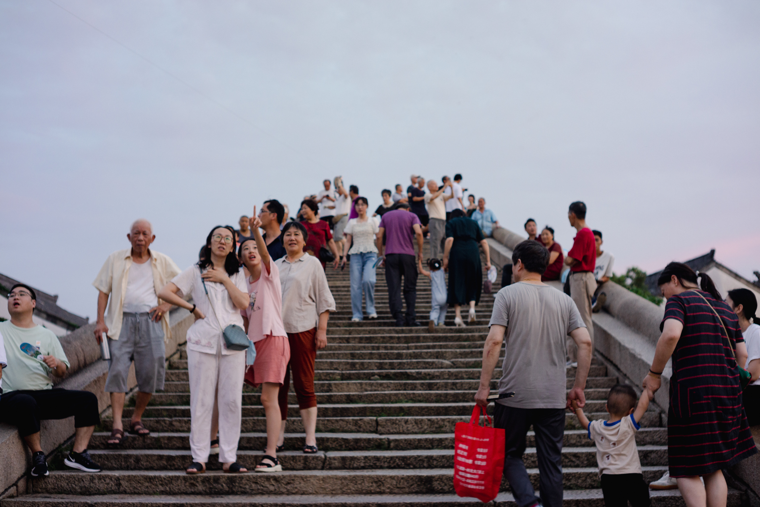 几个大叔在桥头放风筝,桥上桥下的游客大半抬头仰望,只见风筝早已渺入天中,线缆上缠满灯珠,闪烁而上。可惜天色还早,否则足以闭月遮星,在黑夜中彰显华丽。