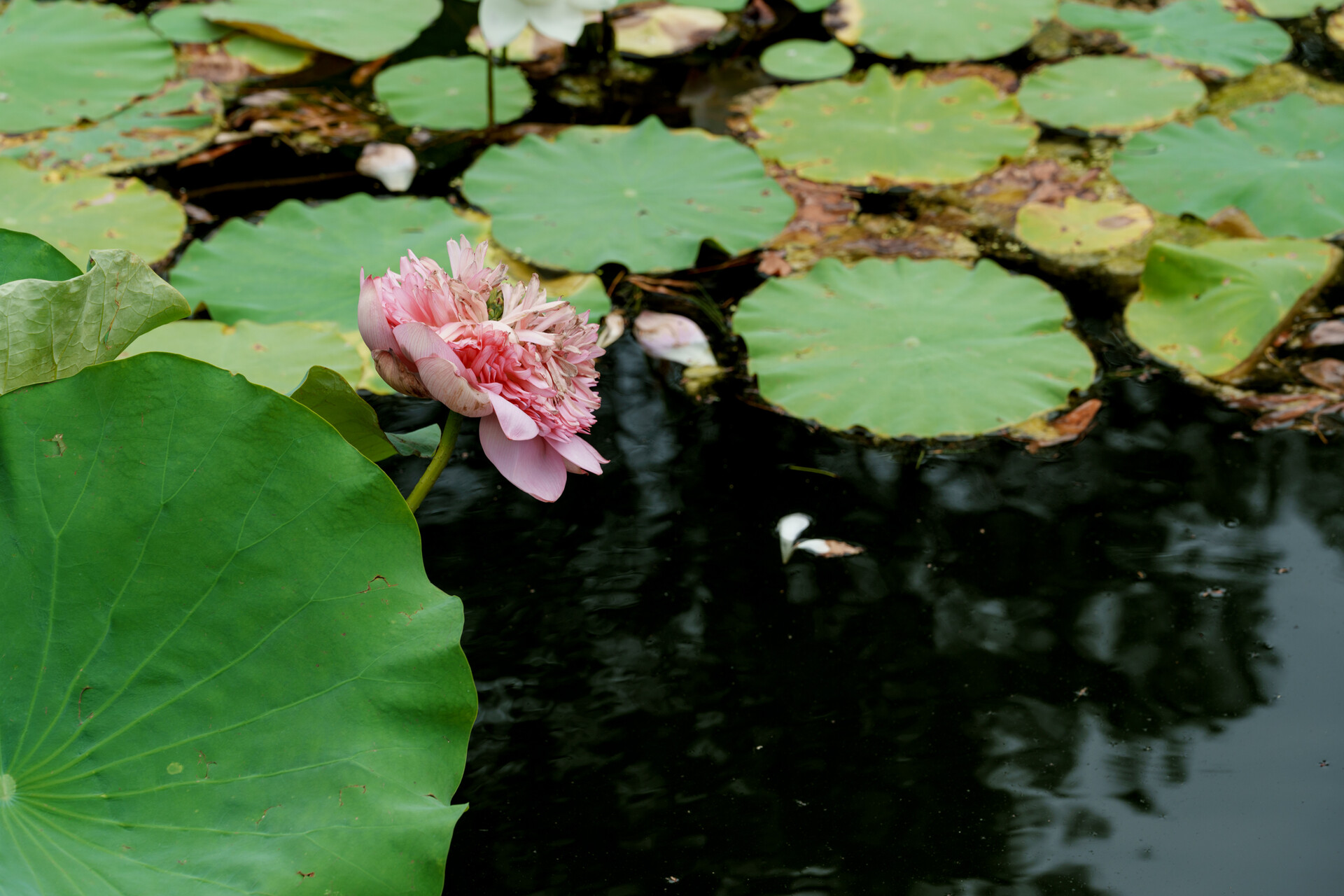 大雄宝殿前的莲池内,几株重瓣荷花摇曳于水中,花瓣外缘渐露枯槁萎败之色,花期倏将逝,花瓣纷零落,清风池上来,莲叶焉足托?