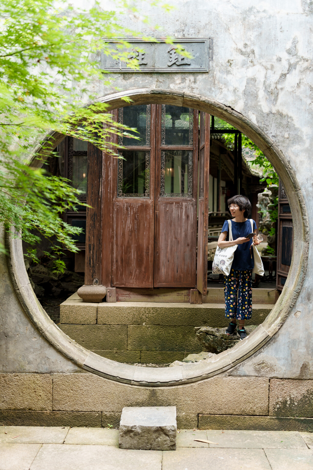 假山之侧下方是四面厅,地形虽然逼仄,但一点不妨碍它的好,四面开轩,疏畅通透,凉风飒然,胸中积虑都一时吹散了。两侧植梅桂紫藤之属,后面是一扇满月圆洞门,拍照取景绝佳。可惜我带的镜头不广,竟然没有拍一张全景,真真气煞。