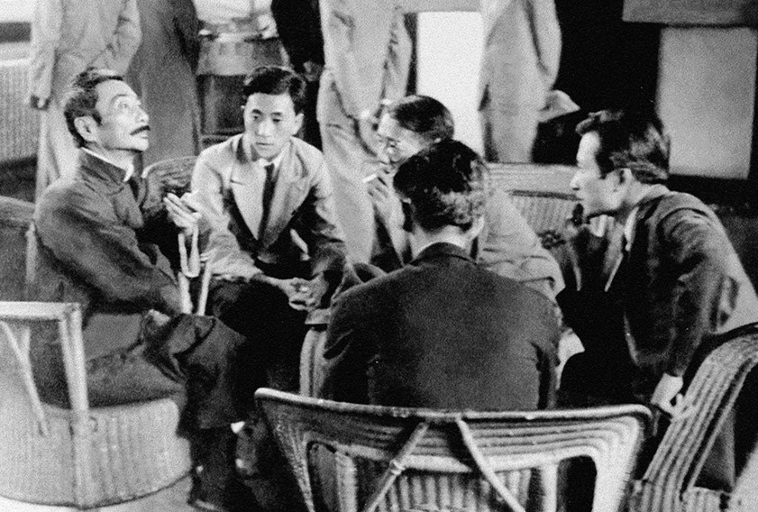 左起,史沫特莱、萧伯纳、宋庆龄、蔡元培、伊罗生、林语堂、鲁迅。立于蔡元培身后者为伊罗生。