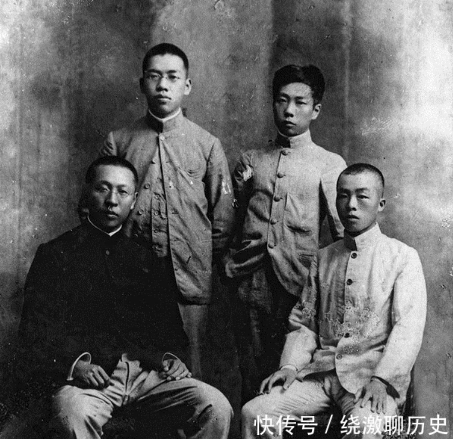 前排左坐者或为抑卮,其右未审何人。后排立者,左季黻,右鲁迅,时鲁迅犹未蓄须。观抑卮面丰神旺,又异于1909年之病弱清癯。故其时当在1903年鲁迅剪辫之后,而1904年抑卮归国以前。